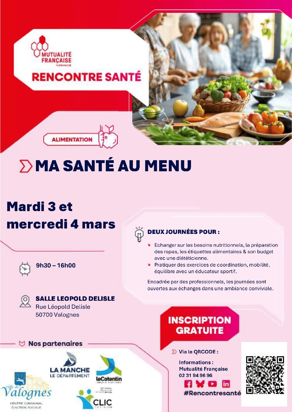 Les 3 et 4 mars, de 9h30 à 16h00, deux journées à Valognes, salle Delisle, pour mettre « Ma santé au menu » avec la Mutualité Française Normandie : alimentation (besoins, préparation, étiquettes, budget…) et activité physique (coordination, mobilité, équilibre) seront au menu de ces 2 journées complètes. Pour les 60 ans et plus, gratuit, places limitées Inscription obligatoire sur https://normandie.mutualite.fr/evenements/ma-sante-au-menu-valognes/ Renseignement et aide possible au 02 31 94 96 96