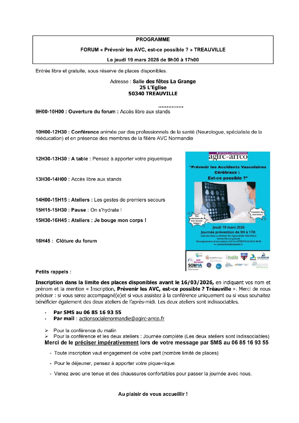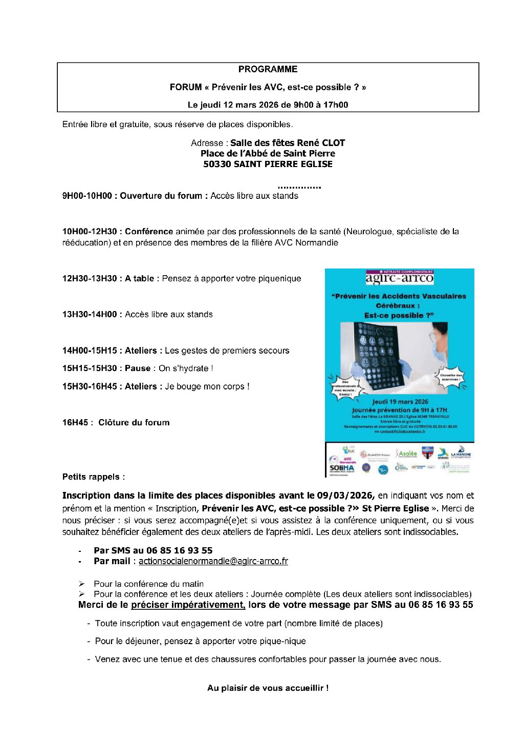 Jeudi 12 mars et jeudi 19 mars : « Prévenir les Accidents Vasculaires Cérébraux (AVC) : est-ce possible ? » De 9h00 à 17h - Salle René CLOT à Saint-Pierre-Eglise le 12 mars - Salle la Grange à Tréauville le 19 mars. La journée est pour tout public, gratuite - Renseignement et inscription aux ateliers obligatoire, par SMS en précisant vos nom et prénom, et le lieu qui vous intéresse au 06 85 16 93 55 ou actionsocialenormandie@agirc-arrco.fr