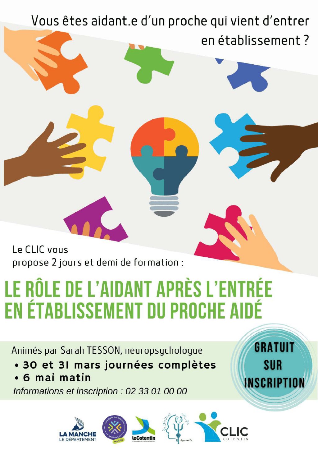 « Le rôle de l’aidant après l’entrée en établissement du proche aidé », formation de 2 jours et demi, proposée par le CLIC et une neuropsychologue, les 30 et 31 mars et le 6 mai matin. Lieu à définir selon les inscriptions. Pour les aidant.e dont le proche vient d’entrer en établissement. Gratuit, sur inscription obligatoire au 02 33 01 00 00