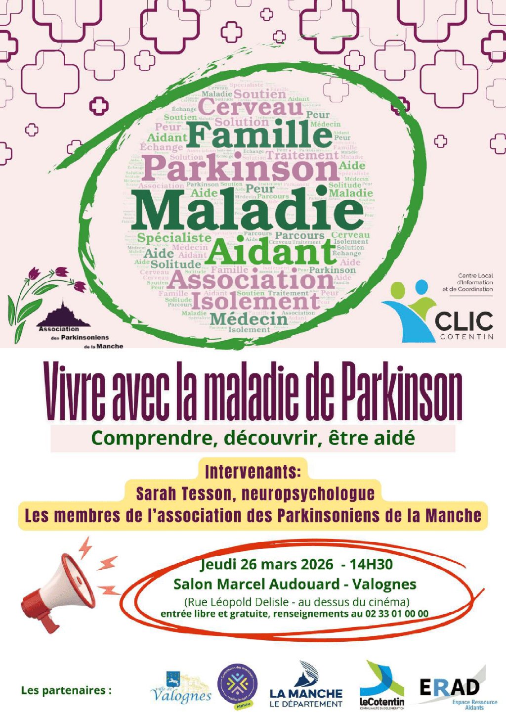 « Vivre avec la maladie de Parkinson » comprendre, découvrir, être aidé, conférence par Sarah Tesson, neuropsychologue, jeudi 26 mars à 14h30 à Valognes, salon Marcel Audouard. Interventions de l’association des parkinsoniens de la Manche au cours de l’après-midi. Gratuit, tout public, sans inscription - Renseignement au 02 33 01 00 00 ou par mail contact@clicducotentin.fr