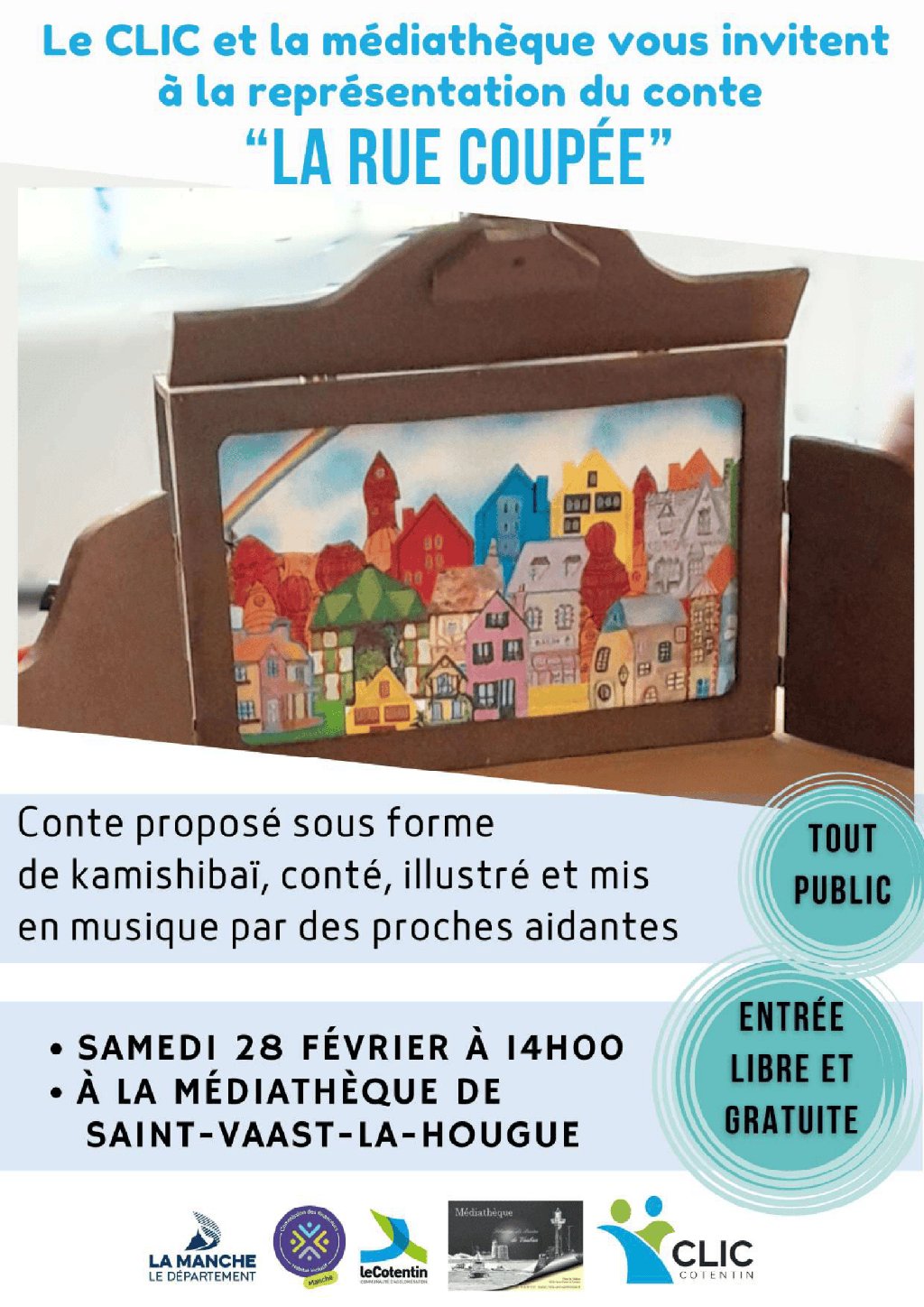 Samedi 28 février à 14h, représentation du conte « la rue coupée » par les aidantes qui en ont fait un kamishibaï, à la médiathèque de Saint-Vaast-la-Hougue. Pour tout public, gratuit - Renseignement au 02 33 01 00 00