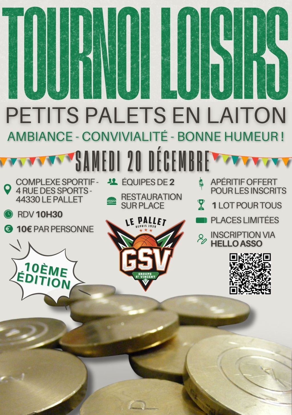 Préparez vos meilleurs lancers ! Le GSV organise son Tournoi de Petits Palets, le samedi 20 décembre à la salle de sport du Pallet. Venez défier vos amis et voisins dans une ambiance chaleureuse et décontractée !