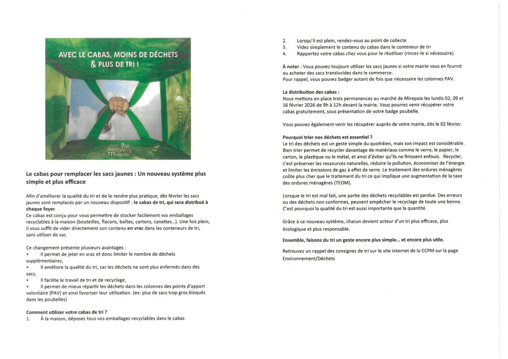 LES CABAS DE TRI SERONT DISTRIBUÉS PAR LES EMPLOYÉS MUNICIPAUX A TOUS LES FOYERS QUI UTILISENT LES BORNES D'APPORT VOLONTAIRE.