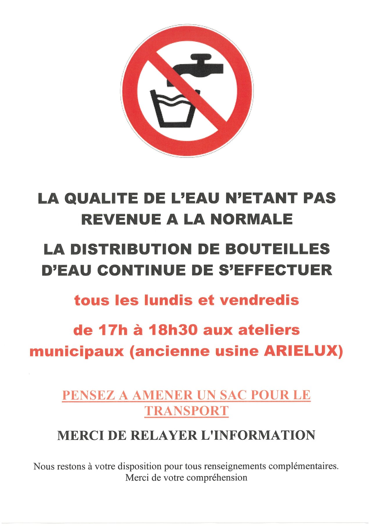 ATTENTION !! CHANGEMENT DU LIEU DE DISTRIBUTION D'EAU