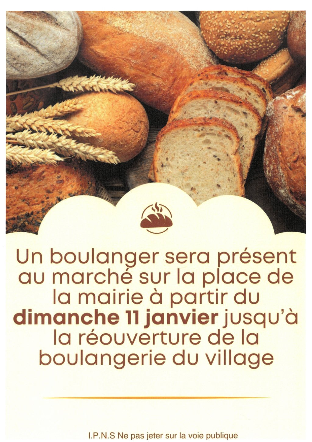 Un boulanger sera présent au marché sur la place de la Mairie à partir de ce dimanche et jusqu'à la réouverture de la boulangerie du village.