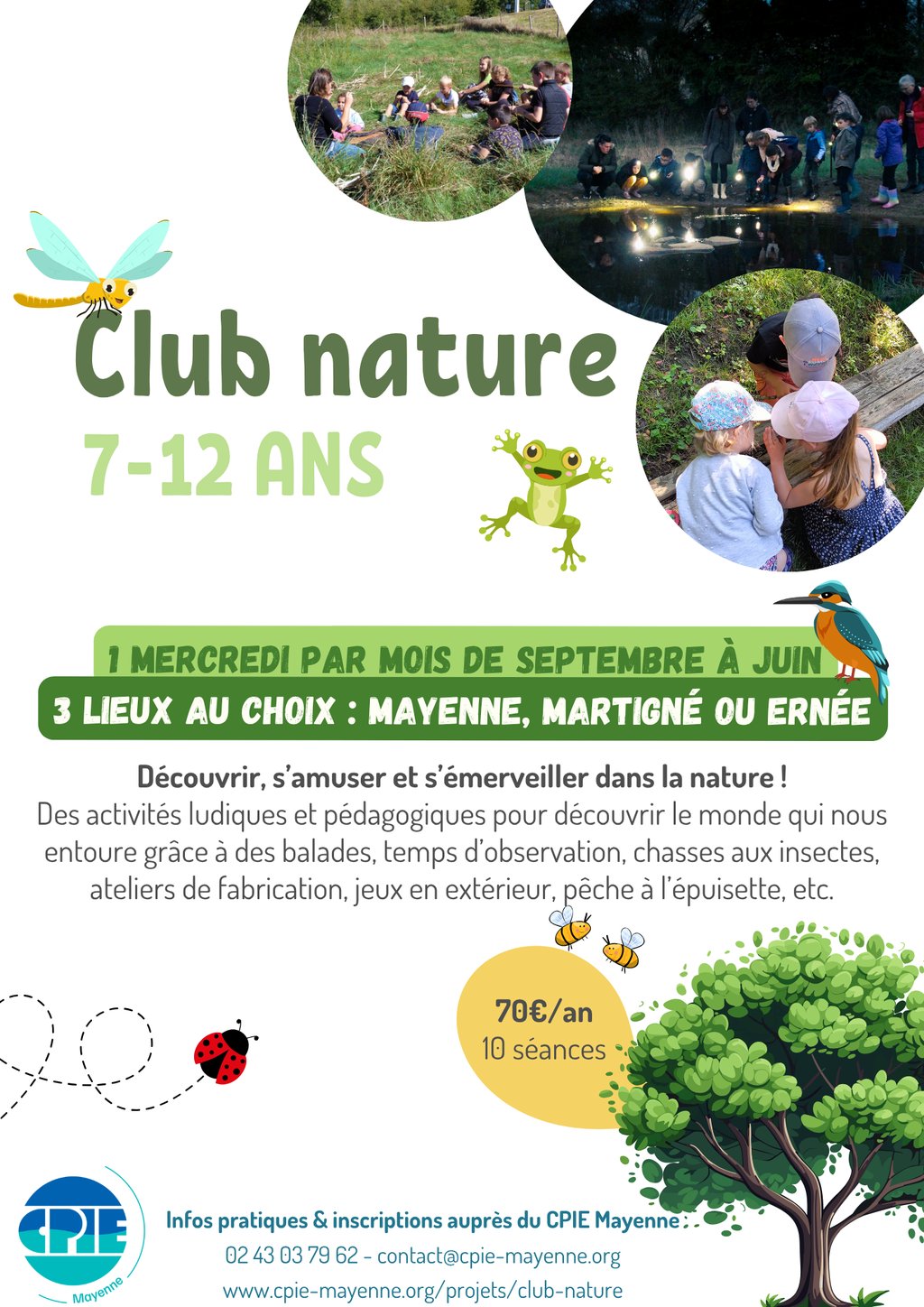 Le CPIE Mayenne (association loi 1901) anime un club nature pour les enfants âgés de 7 à 12 ans. Un mercredi par mois les enfants participent à des activités leurs permettant de se reconnecter à la nature: observation de la faune et de la flore, jeux en extérieur, balades, activités manuelles avec des éléments naturelles...