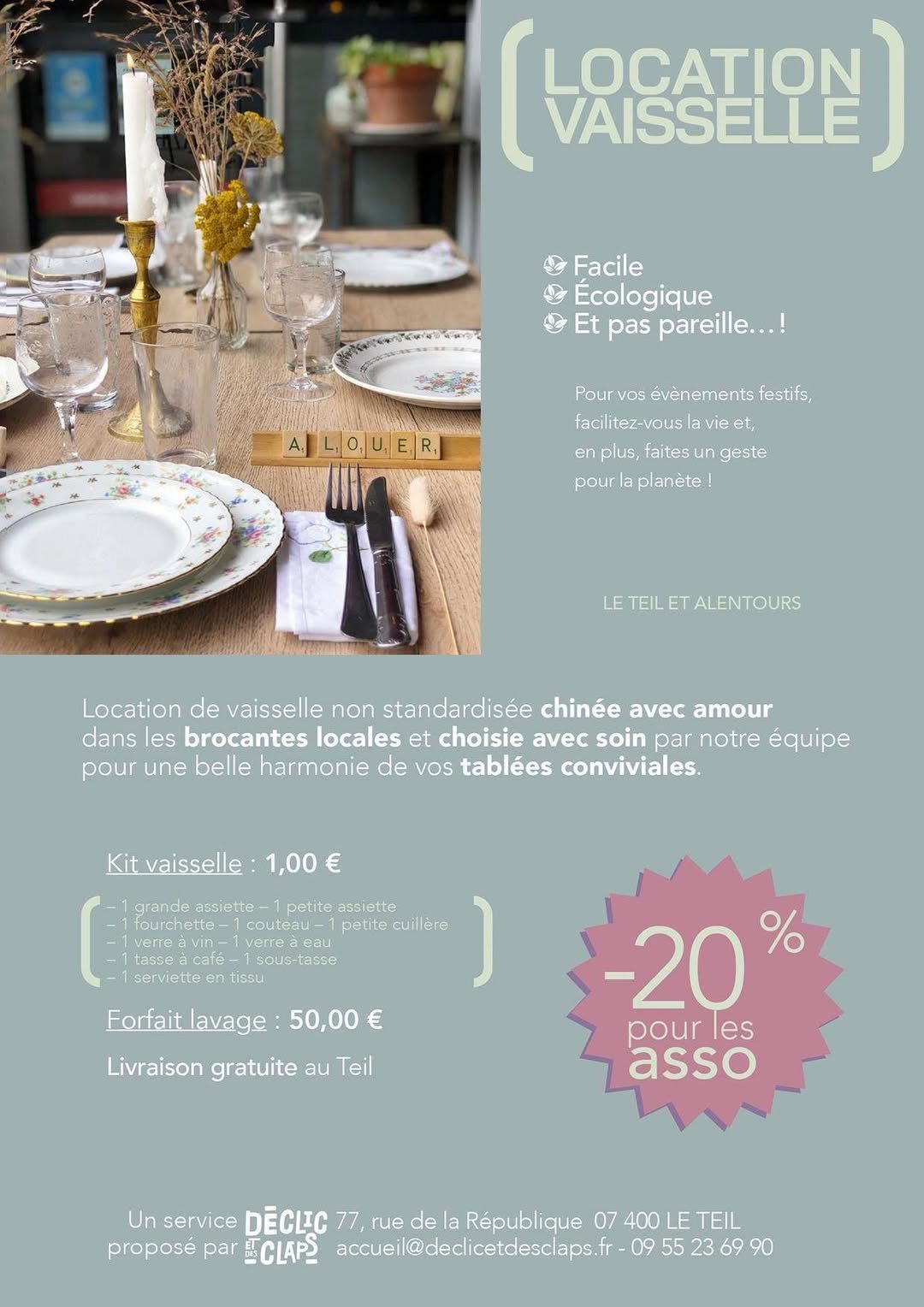 Chez Déclic et des Claps, nous proposons de la vaisselle vintage chinée avec amour dans les brocantes locales. Chaque pièce est choisie avec soin pour créer de jolies tables conviviales et pleines de caractère.