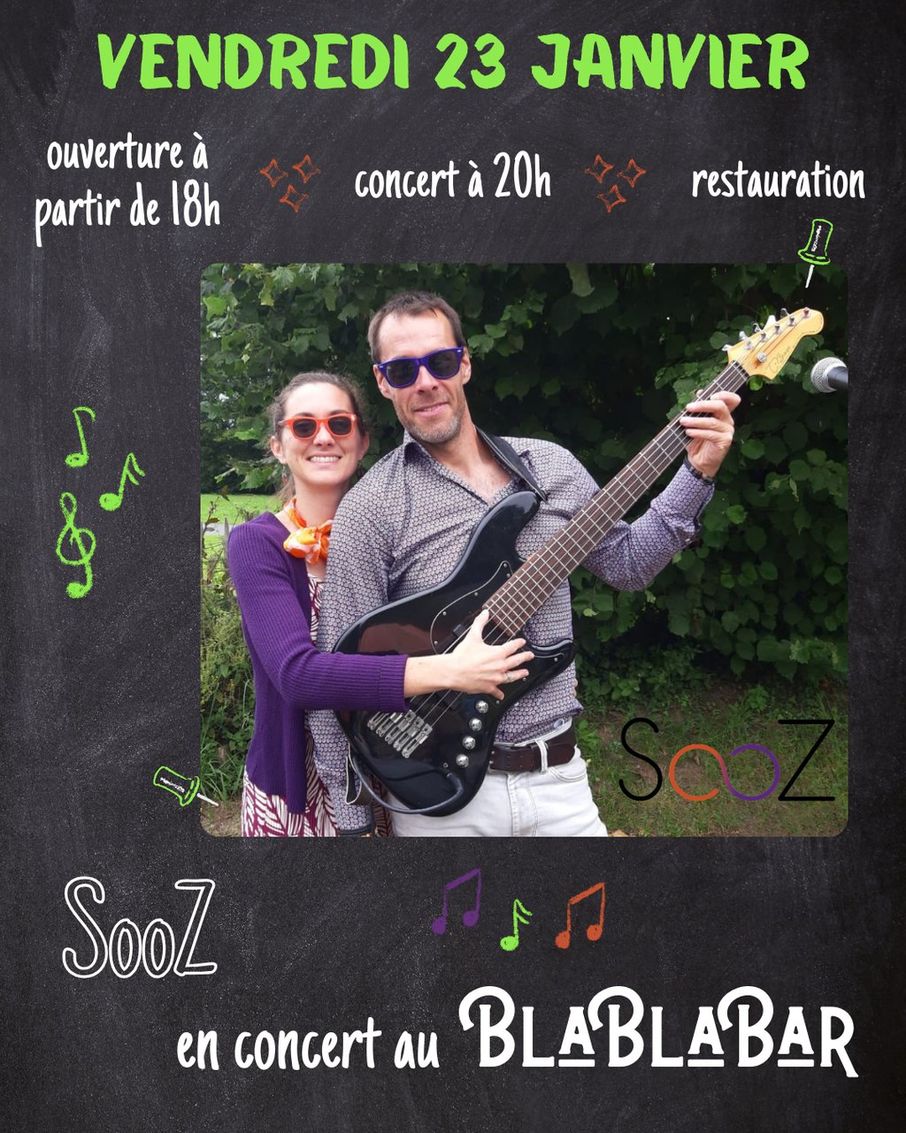 🥁 Le duo SooZ est né de la rencontre multidimensionnelle entre Prisca, chanteuse/pianiste et Guillaume, guitariste. A leurs instruments de prédilection, ils ajoutent une basse, et diverses percussions, présentant ainsi une configuration changeante. Passant d'un instrument à l'autre ou les jouant parfois ensemble, les musiciens du duo SooZ proposent une représentation étoffée de leur répertoire de reprises variété/pop/rock en anglais et en français.