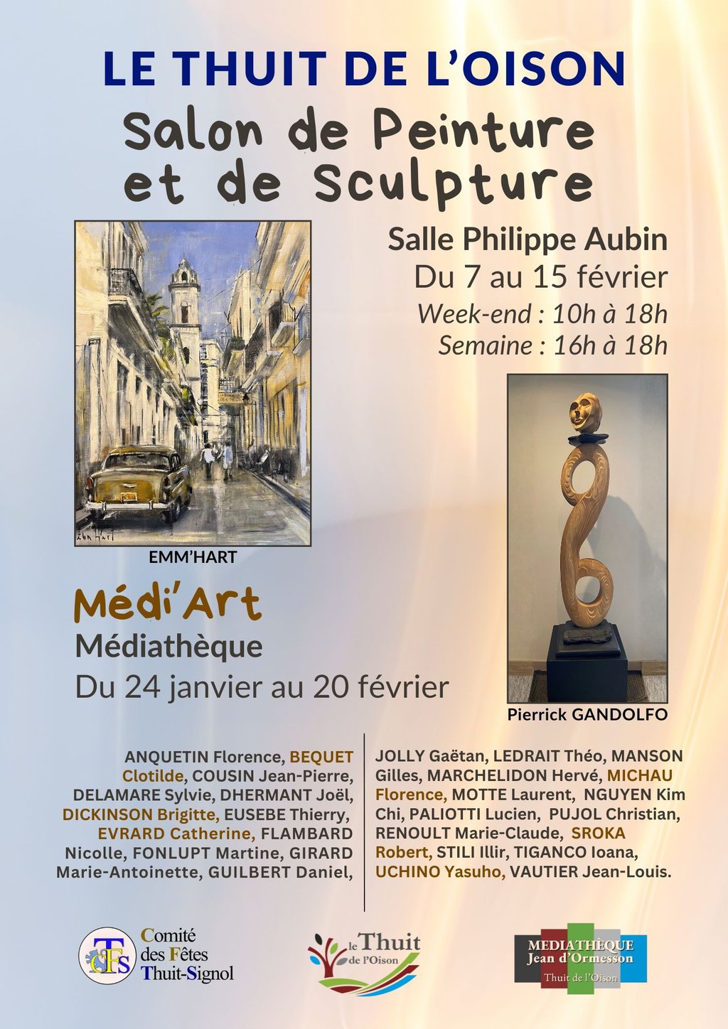 La commune du Thuit de l’Oison a le plaisir de vous inviter à découvrir le Salon de Peinture et de sculpture, un rendez-vous artistique incontournable mettant à l’honneur des artistes aux univers variés.