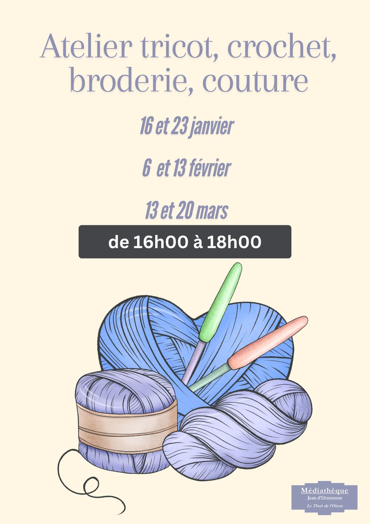 Le matériel de base (aiguilles, pelotes, tissus, boutons…) sera disponible à la médiathèque, néanmoins si vous avez vos propres projets, n’hésitez pas à venir avec.