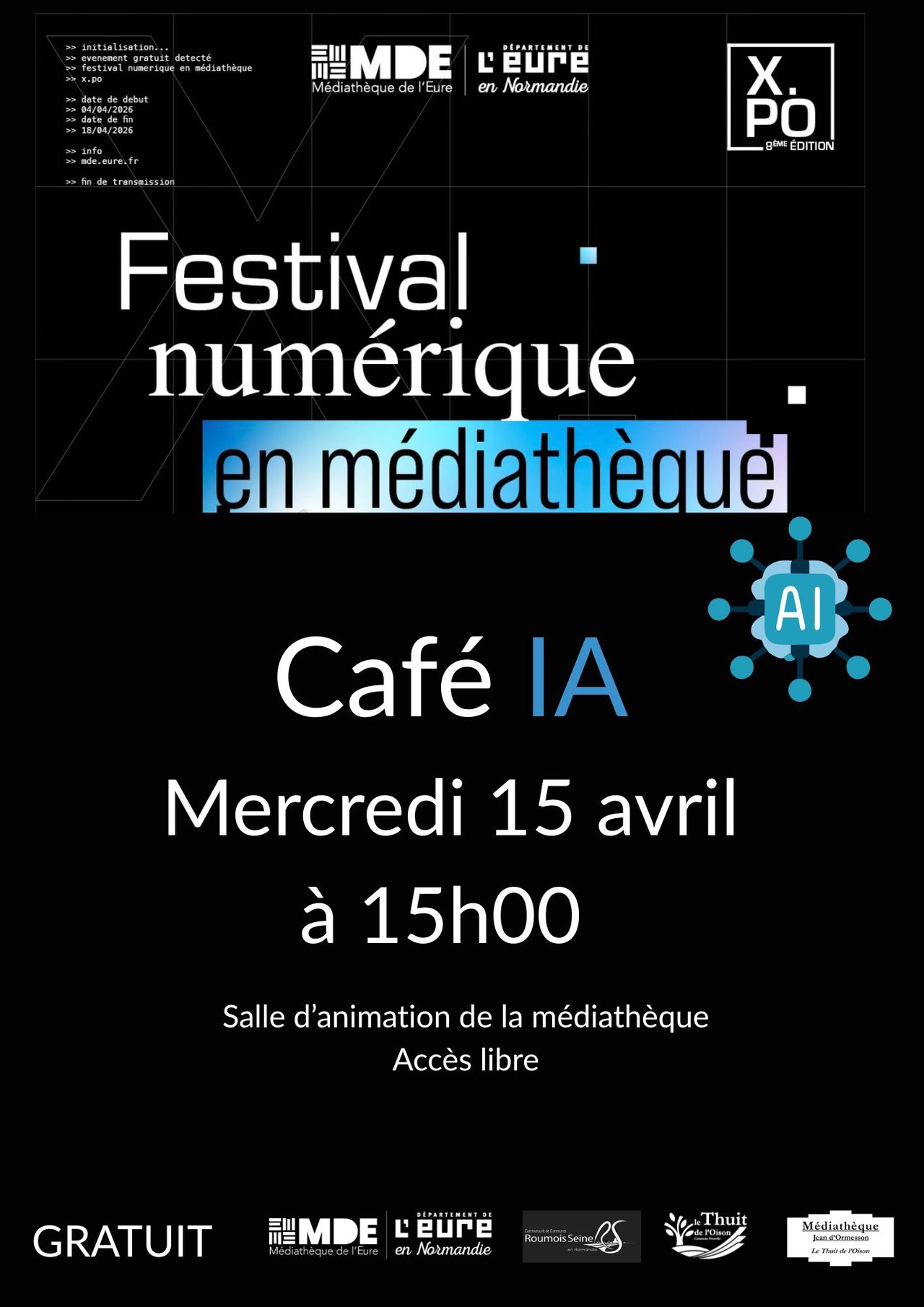 La Médiathèque a le plaisir de vous inviter à participer à notre Café IA, un rendez-vous convivial et ouvert à tous, conçu pour explorer, comprendre et débattre sur l’intelligence artificielle et ses enjeux dans notre société. Cette rencontre est organisée dans le cadre de X.PO Expérience des possibles.