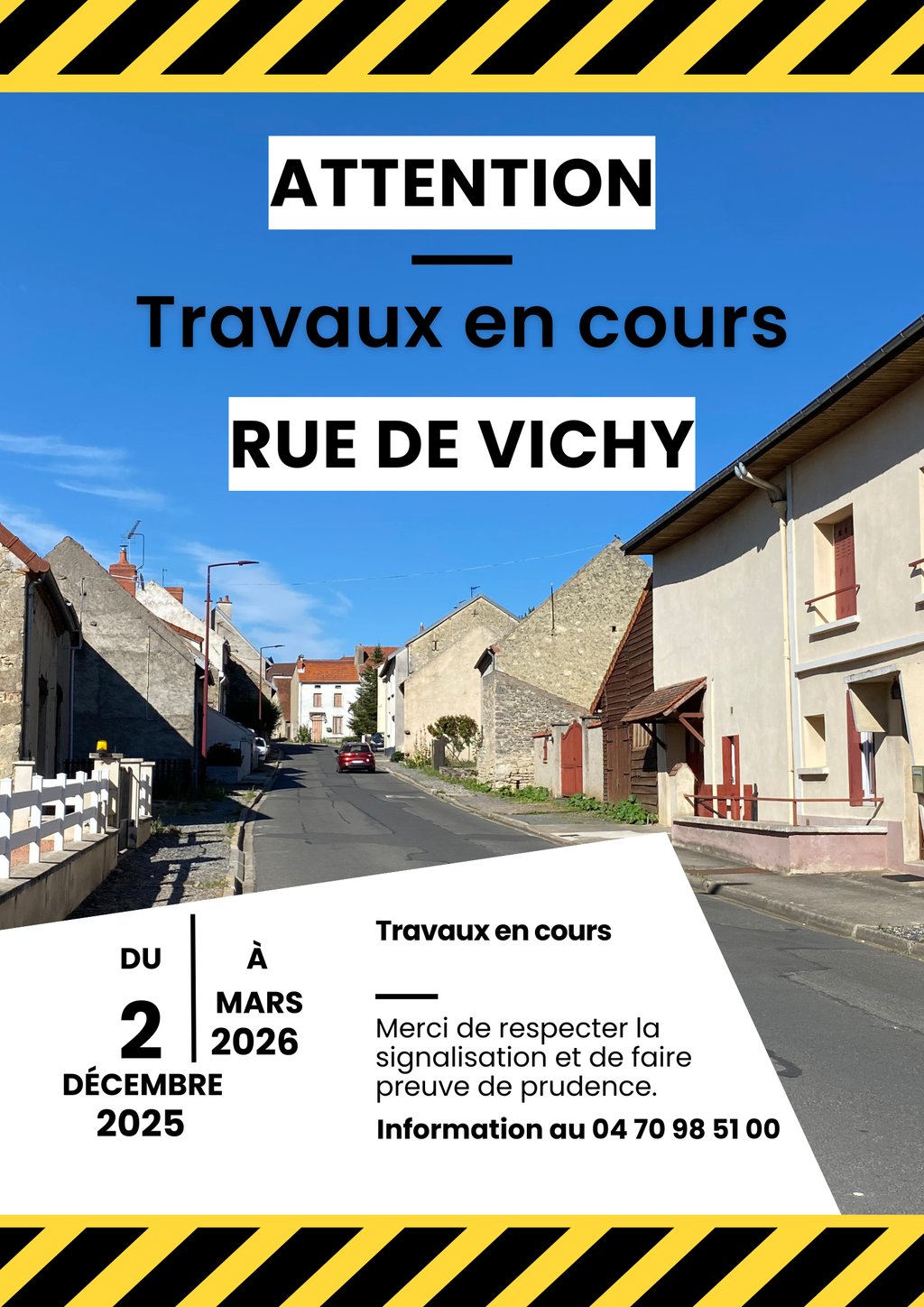 Les travaux d’aménagement de la rue de Vichy ont débuté ce mardi 2 décembre. La durée approximative des travaux est de 4 mois. Cet aménagement essentiel pour la commune va engendrer quelques difficultés de circulation sur la commune. Pour la sécurité de tous, il est important de respecter la signalisation mise en place.
