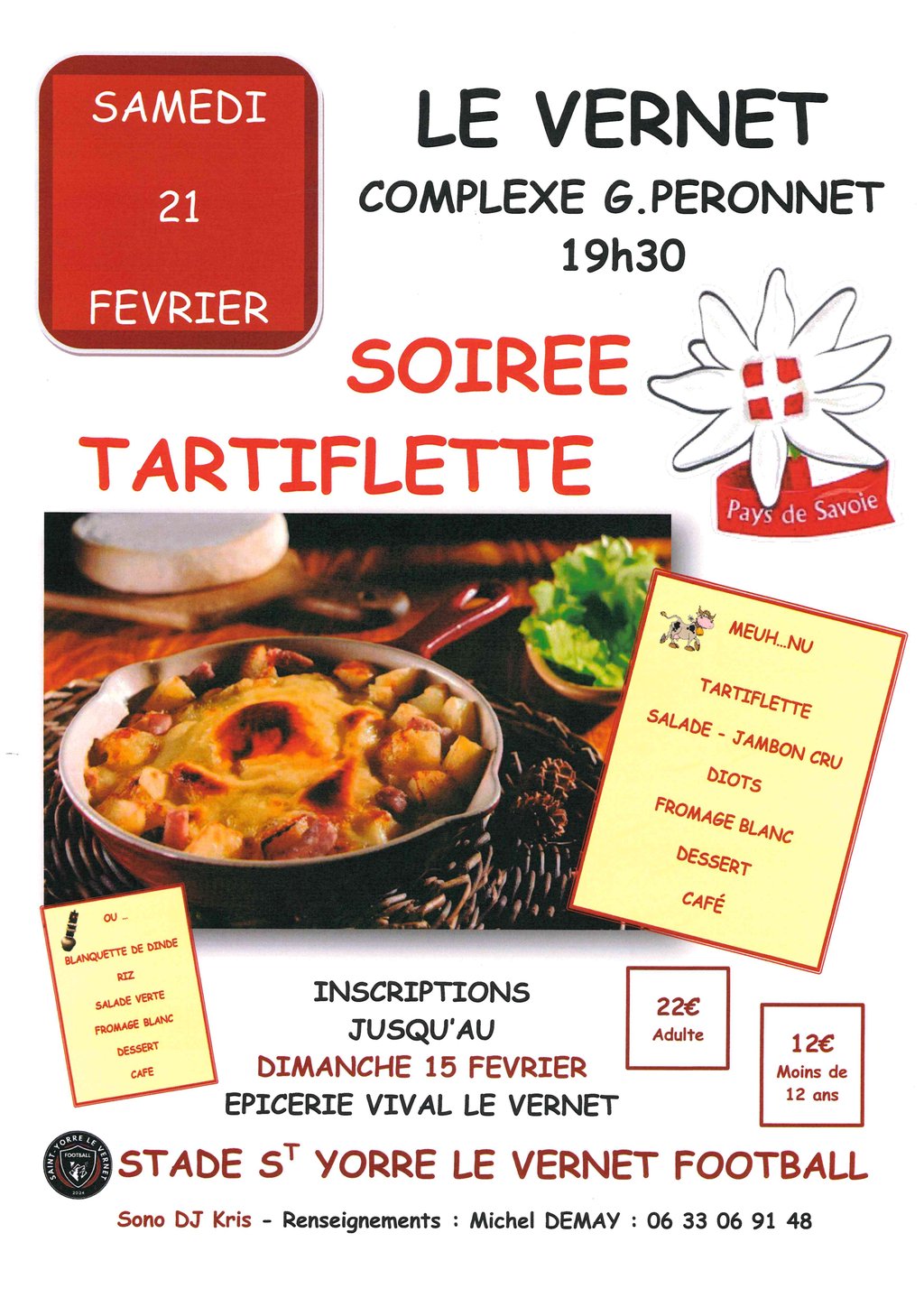 ⚽ Le club Stade St Yorre Le Vernet Football organise une soirée gourmande le samedi 21 février à 19h30 au complexe Gabriel Péronnet. Au programme : un menu complet autour de la tartiflette (ou blanquette de dinde) et une animation musicale signée DJ Kris 🎶.
