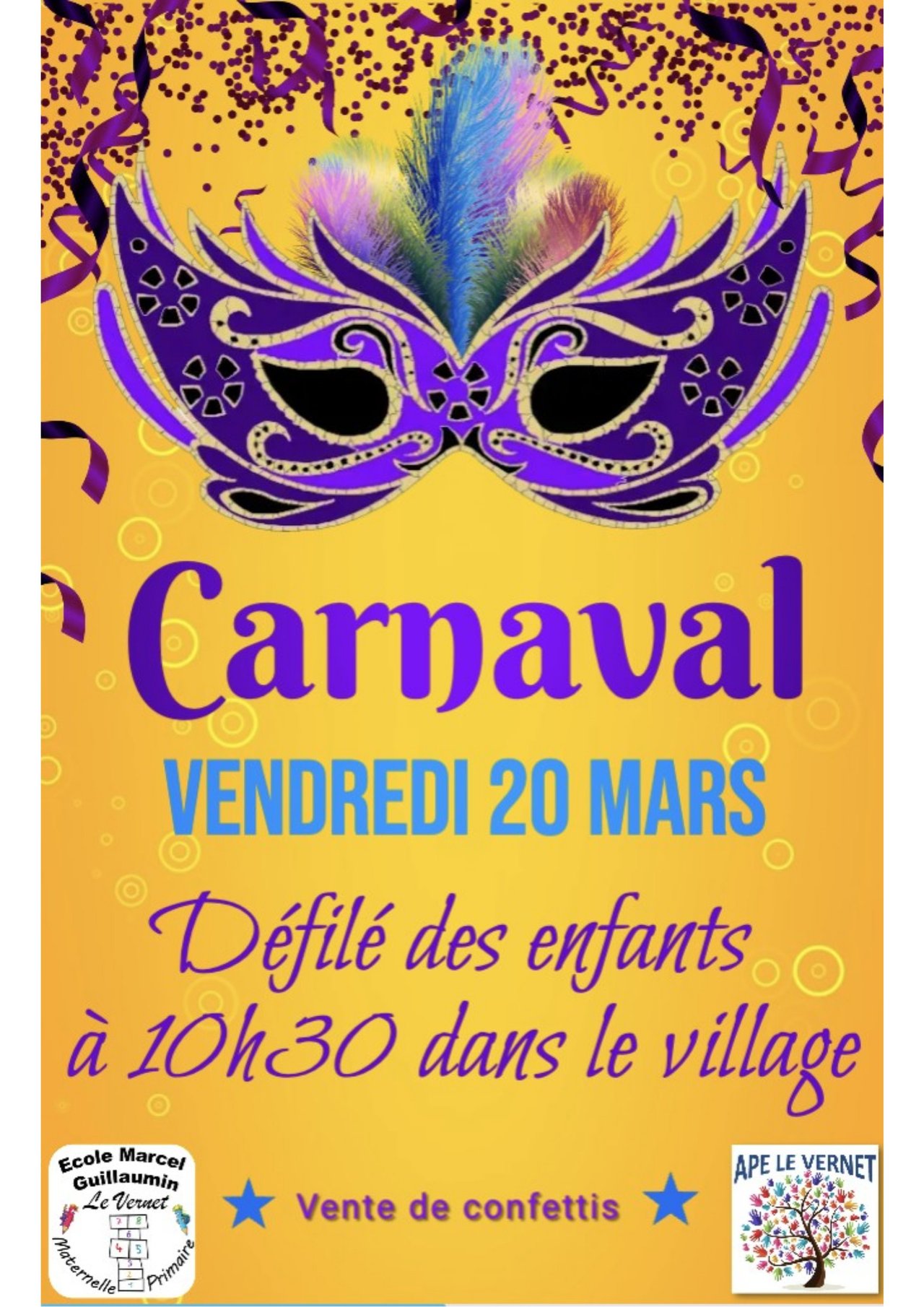 Vendredi 20 mars, le village du Vernet s’anime pour célébrer le Carnaval ! Au programme, un défilé des enfants organisé par l’école Marcel Guillaumin à 10h30. Les rues du village s’illumineront de couleurs, de rires et de confettis pour le plus grand plaisir de tous.