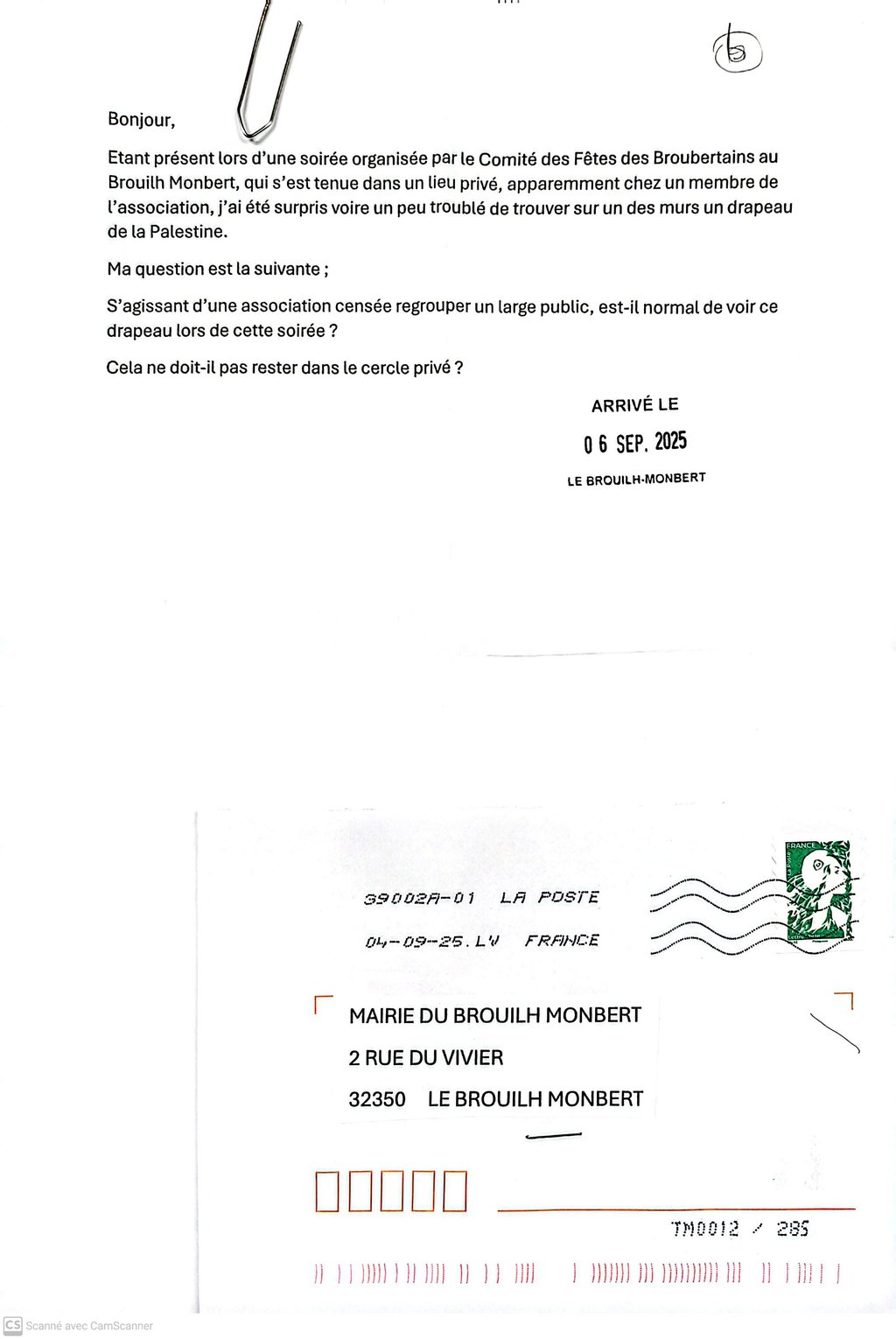 courrier et par messages concernant la présence d’un drapeau palestinien ainsi que l’affirmation