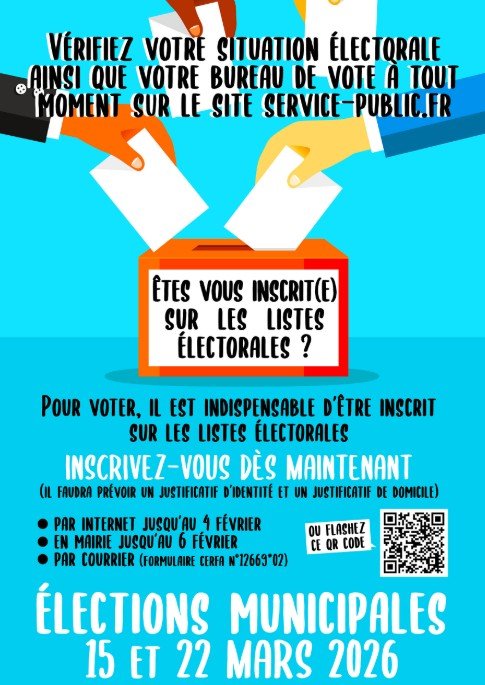 - L'inscription sur les listes électorales est possible jusqu'au 4 février 2026 en ligne et jusqu'au 6 février 2026 en Mairie.