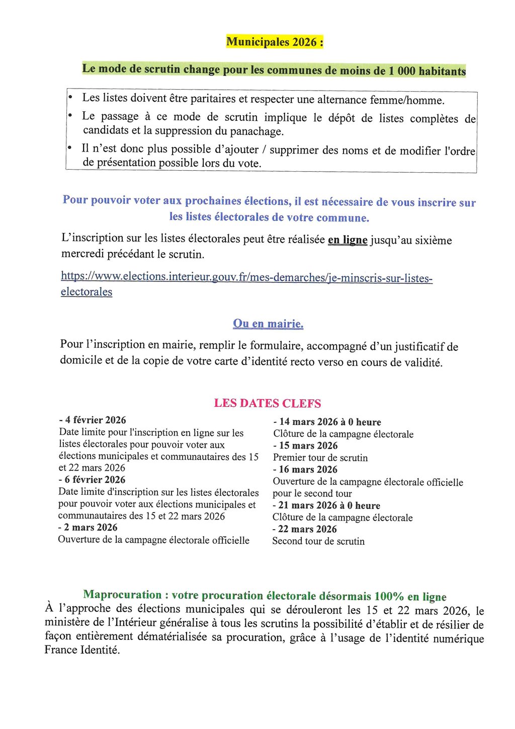 LE MODE DE SCRUTIN CHANGE POUR LES COMMUNES DE MOINSDE 1 000 HABITANTS.