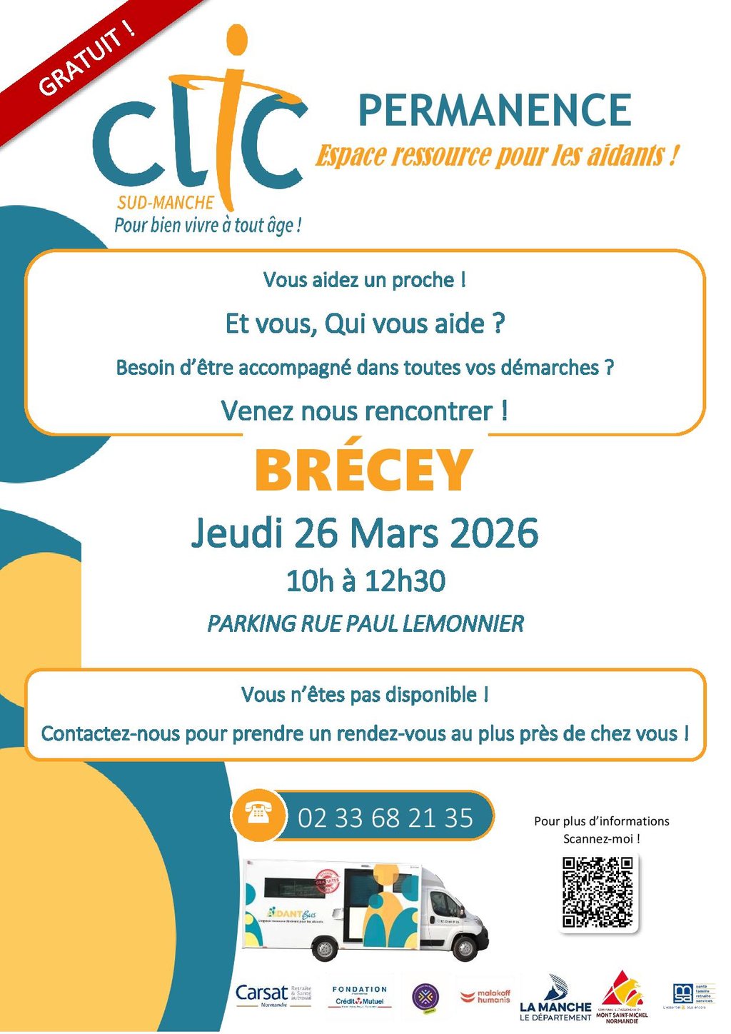 Une permanence de l’Espace Ressource pour les Aidants aura lieu Jeudi 26 Mars de 10h à 12h30 sur le parking Rue Paul Lemonnier à BRÉCEY.