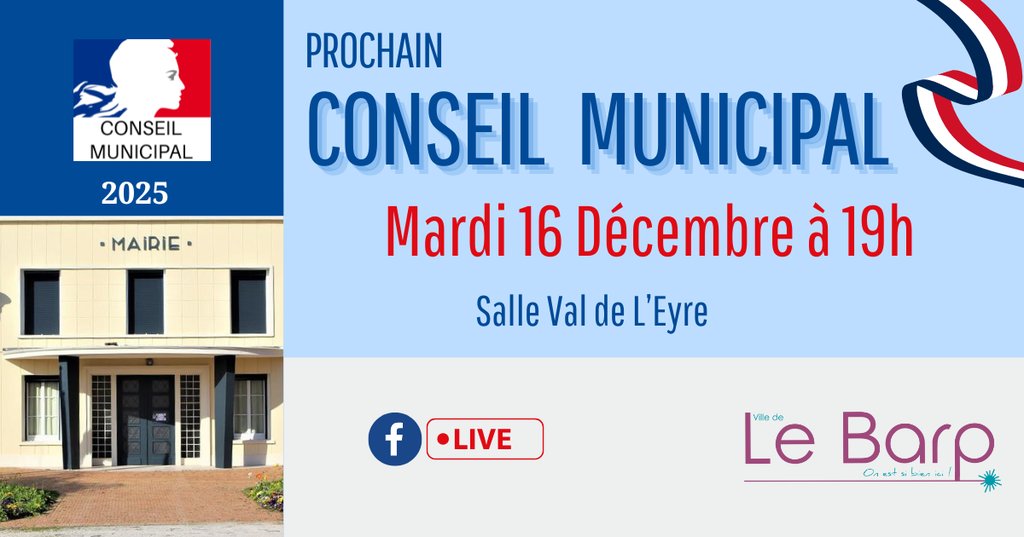 CONSEIL MUNICIPAL : Mardi 16 décembre - 19 heures- Salle du Val de l'Eyre.