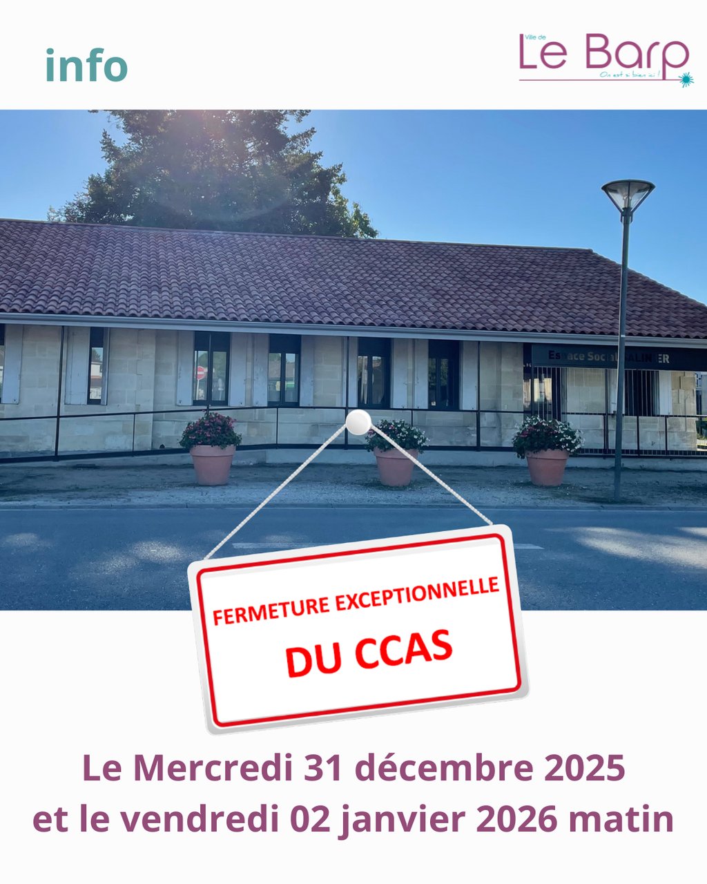 Le CCAS du Barp sera exceptionnellement fermé le Mercredi 31/12 après-midi et le Vendredi 02/12 matin.