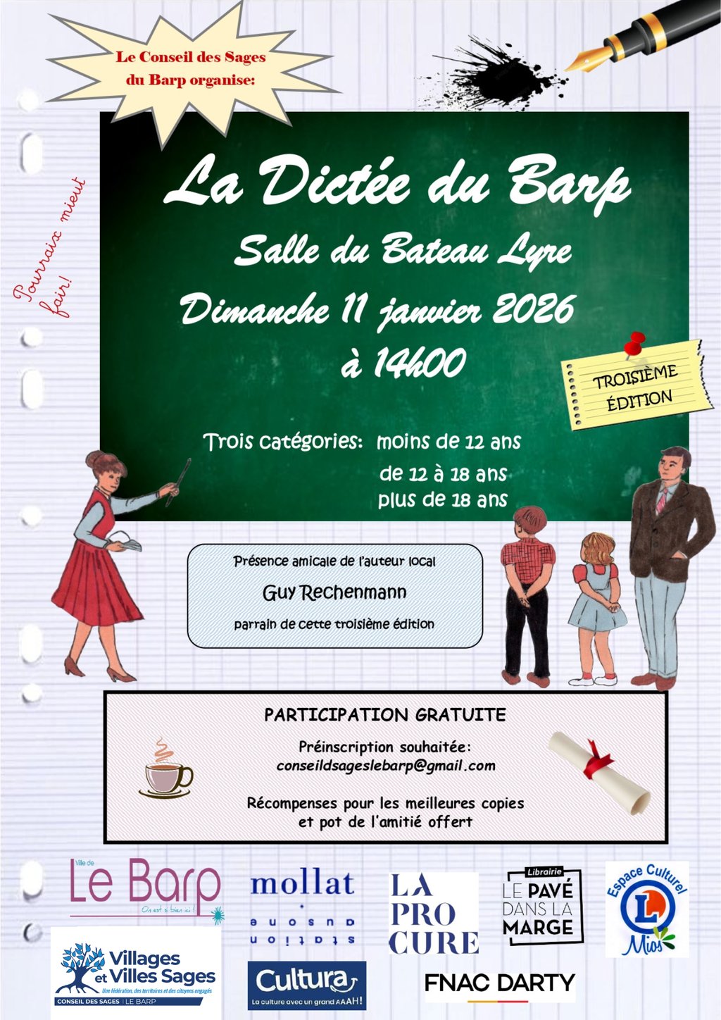 Pour la troisième année consécutive, le Conseil des Sages, avec le concours de la municipalité, organise la Dictée du Barp : elle se déroulera au Bateau Lyre le dimanche 11 janvier à 14 h.