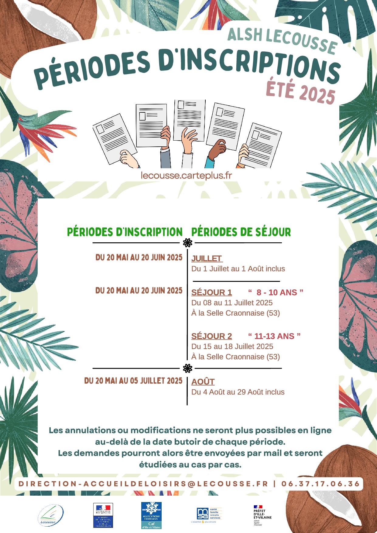🚨 Les annulations ou modifications ne seront plus possibles après la date limite d'inscription de chaque période. Pour toute demande après cette date, merci de nous contacter par mail : 📧 direction-accueildeloisirs@lecousse.fr 📞 06.37.17.06.36