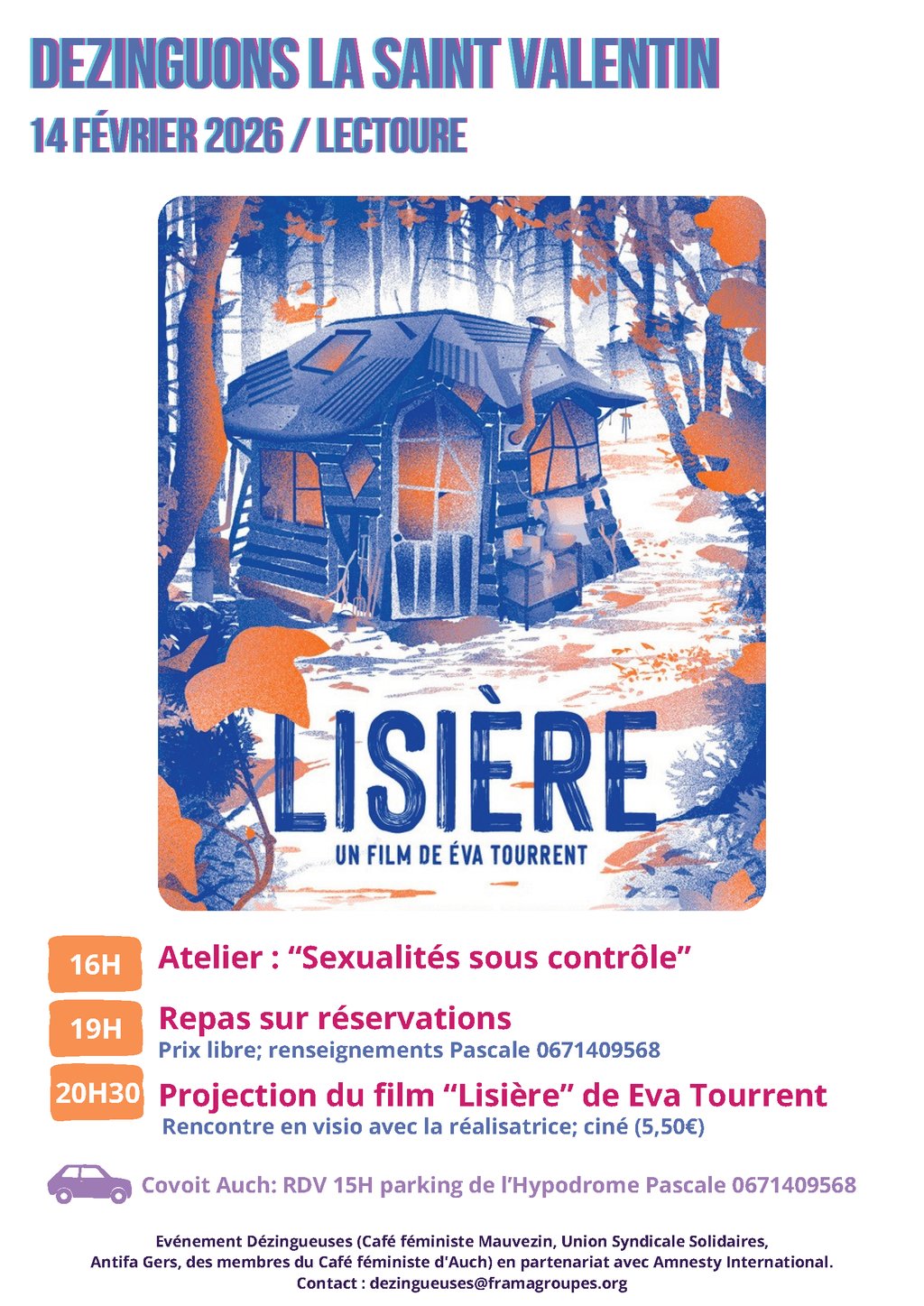 à 16h l'atelier pour questionner l'évolution des lois sur la sexualité comme le repas (buffet à prix libre) se feront au Centre photo de Lectoure et la projection du documentaire à 20h30 au Cinéma Le Sénéchal.