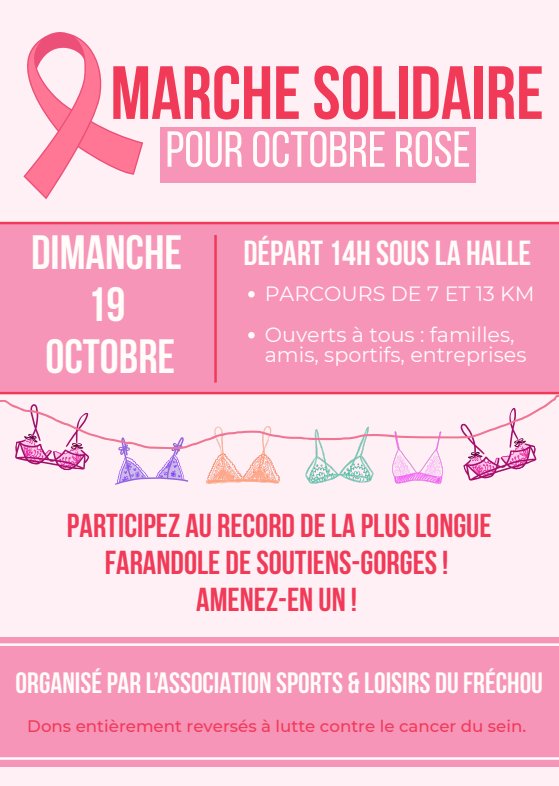 L'Association Sports et Loisirs du Fréchou organise une randonnée pour Octobre Rose le Dimanche 19 Octobre à 14h sous la halle du Fréchou.