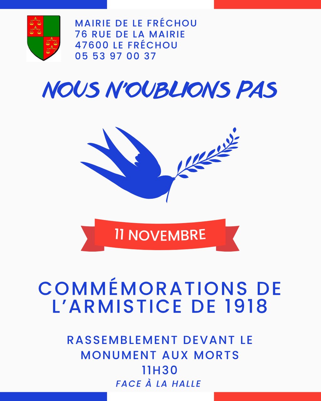 La Mairie et le Conseil Municpal vous convie aux commémorations de l'Armistice du 11 Novembre 1918.