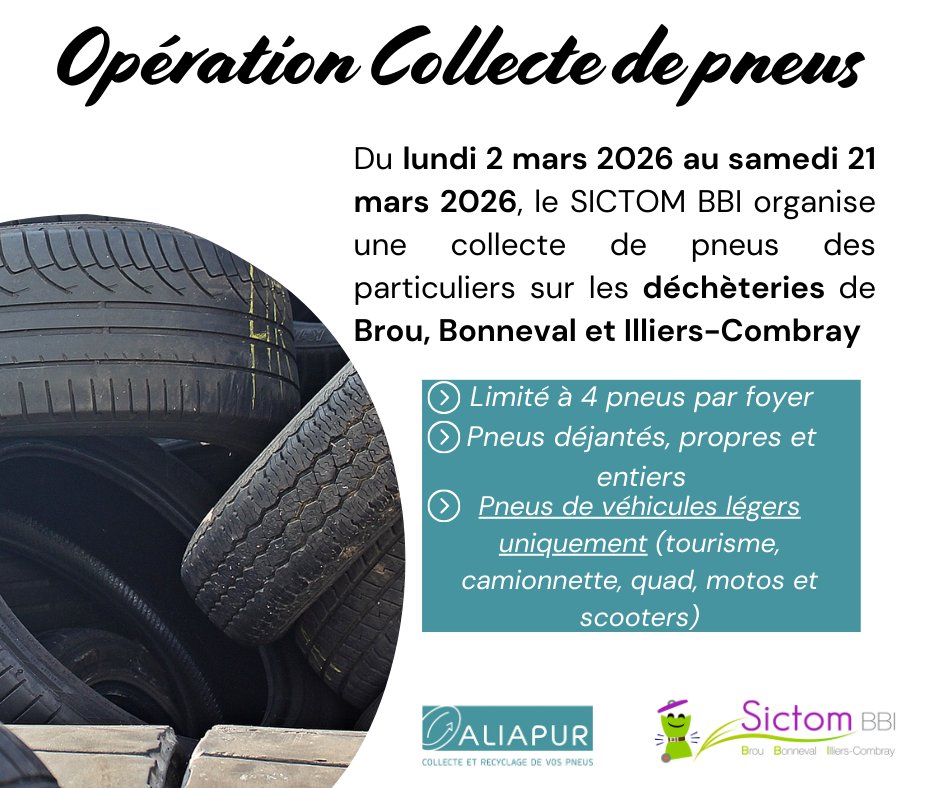 Comme chaque année, le SICTOM BBI organise avec Aliapur une collecte des pneus usagés pour les habitants de son territoire du lundi 2 mars 2026 au samedi 21 mars 2026. Les habitants peuvent rapporter sur les déchèteries de Brou, Bonneval et Illiers-Combray jusqu’à 4 pneus de véhicules légers, motos et scooters par foyer. Ces pneus doivent être propres, entiers et déjantés. Cette collecte est réservée aux particuliers.