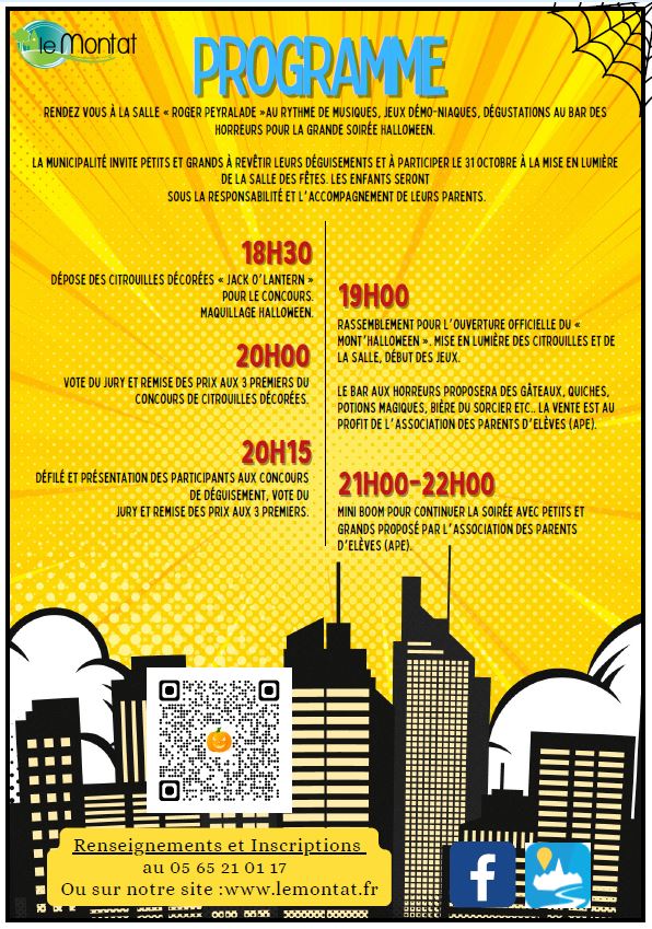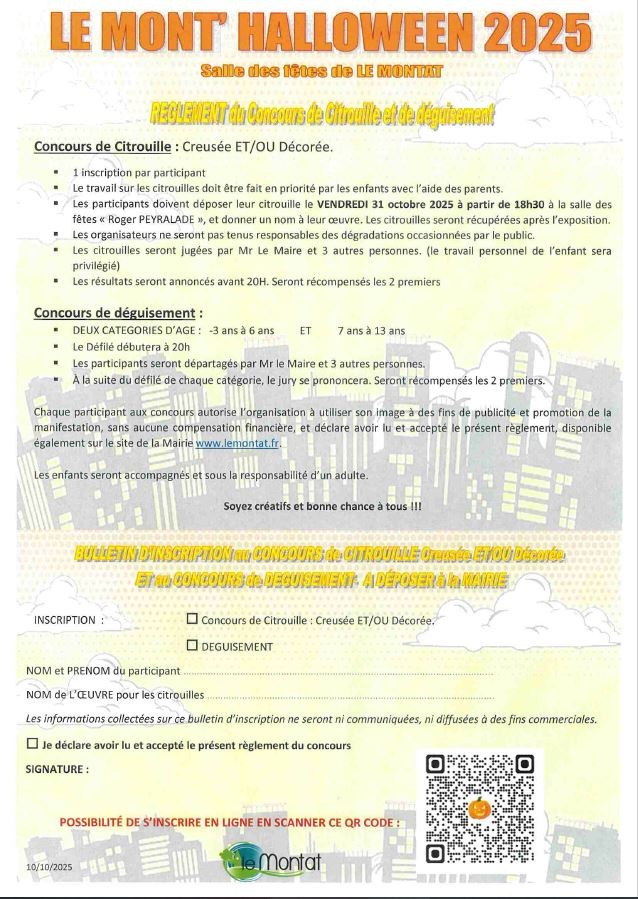 Rendez-vous à la salle des fêtes à 18h30 VENDREDI 31 octobre ; Plus de renseignements ET bulletin d’inscription aux concours sur www. lemontat.fr ET intramuros. Possibilité de s’inscrire en ligne