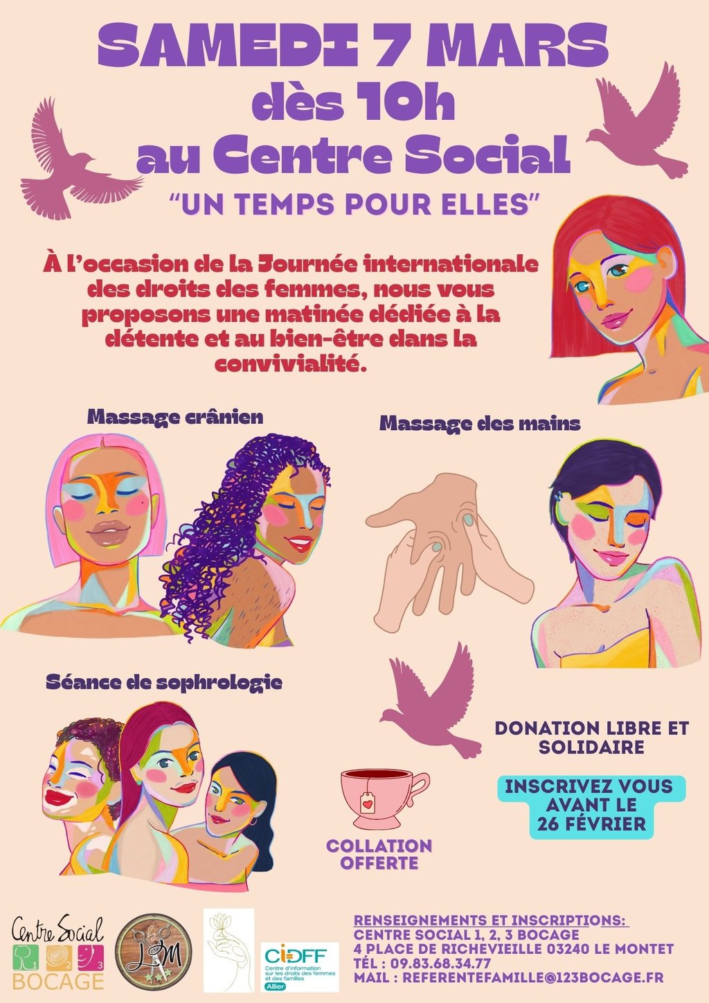 À l’occasion de la Journée internationale des droits des femmes, le Centre Social 1, 2, 3 Bocage vous propose une matinée dédiée au bien-être :