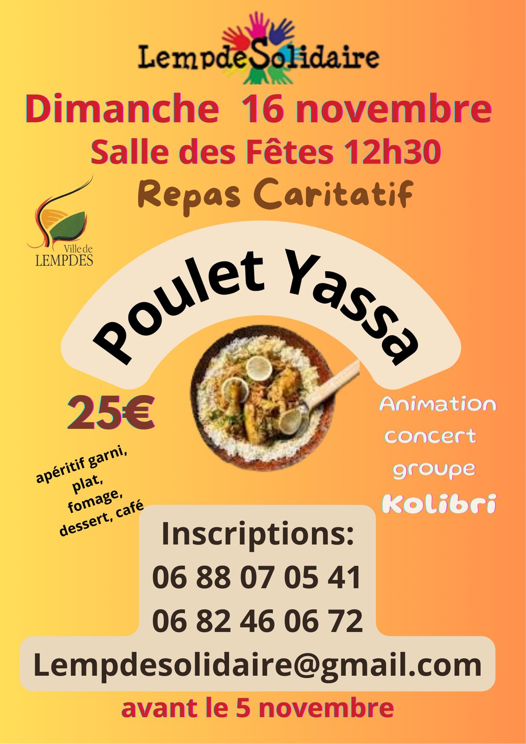 LempdeSolidaire propose son repas caritatif annuel le 16 novembre à 12h30 . Au menu : le traditionnel apéritif garni - poulet Yassa - fromage- dessert- café. Animation- concert donné par le groupe Kolibri.