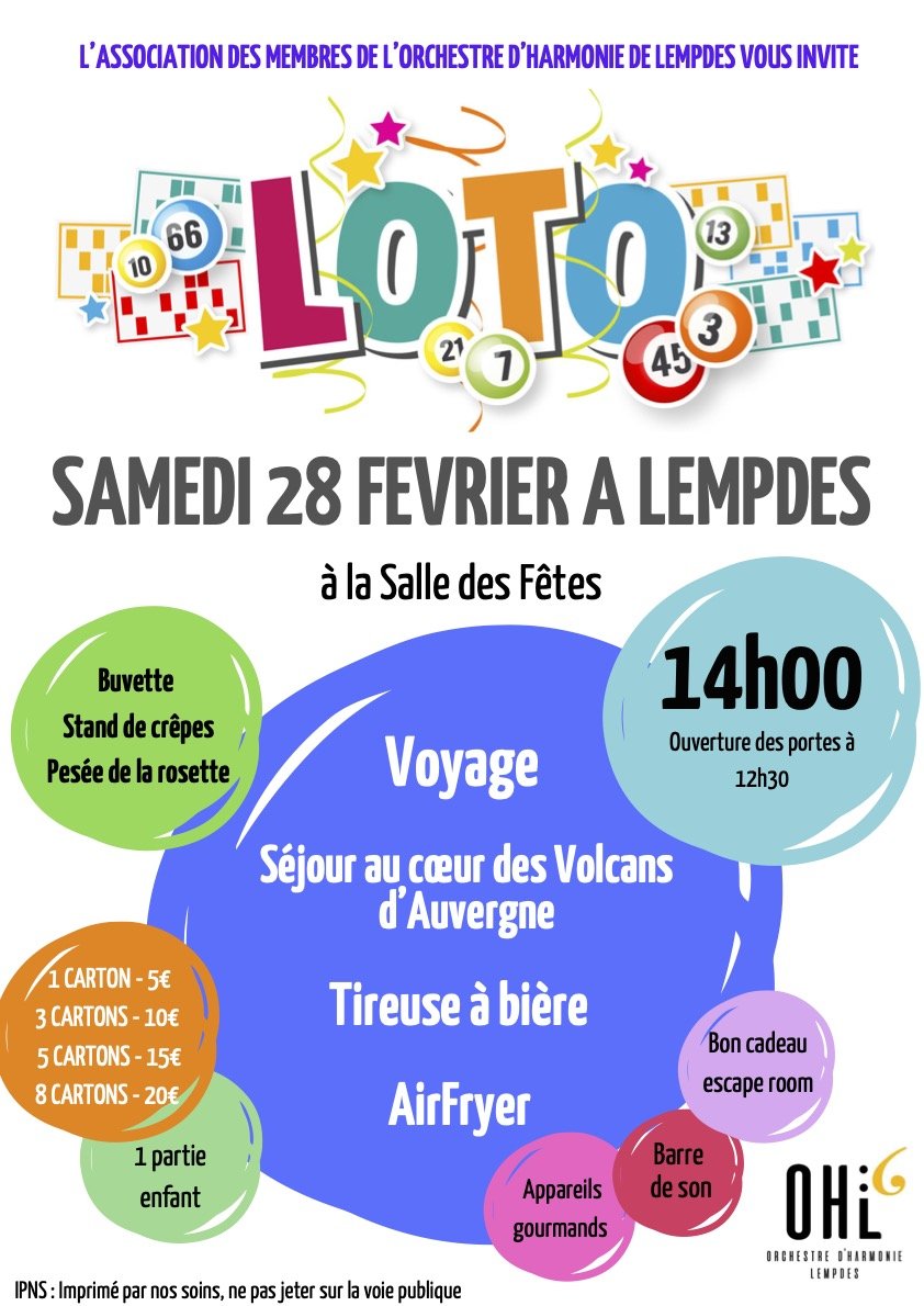 Pour la 3e Saison consécutive, l'Association de l'Orchestre d'Harmonie de Lempdes vous propose de venir gagner de nombreux lots le 28 FEVRIER à la Salle des Fêtes :