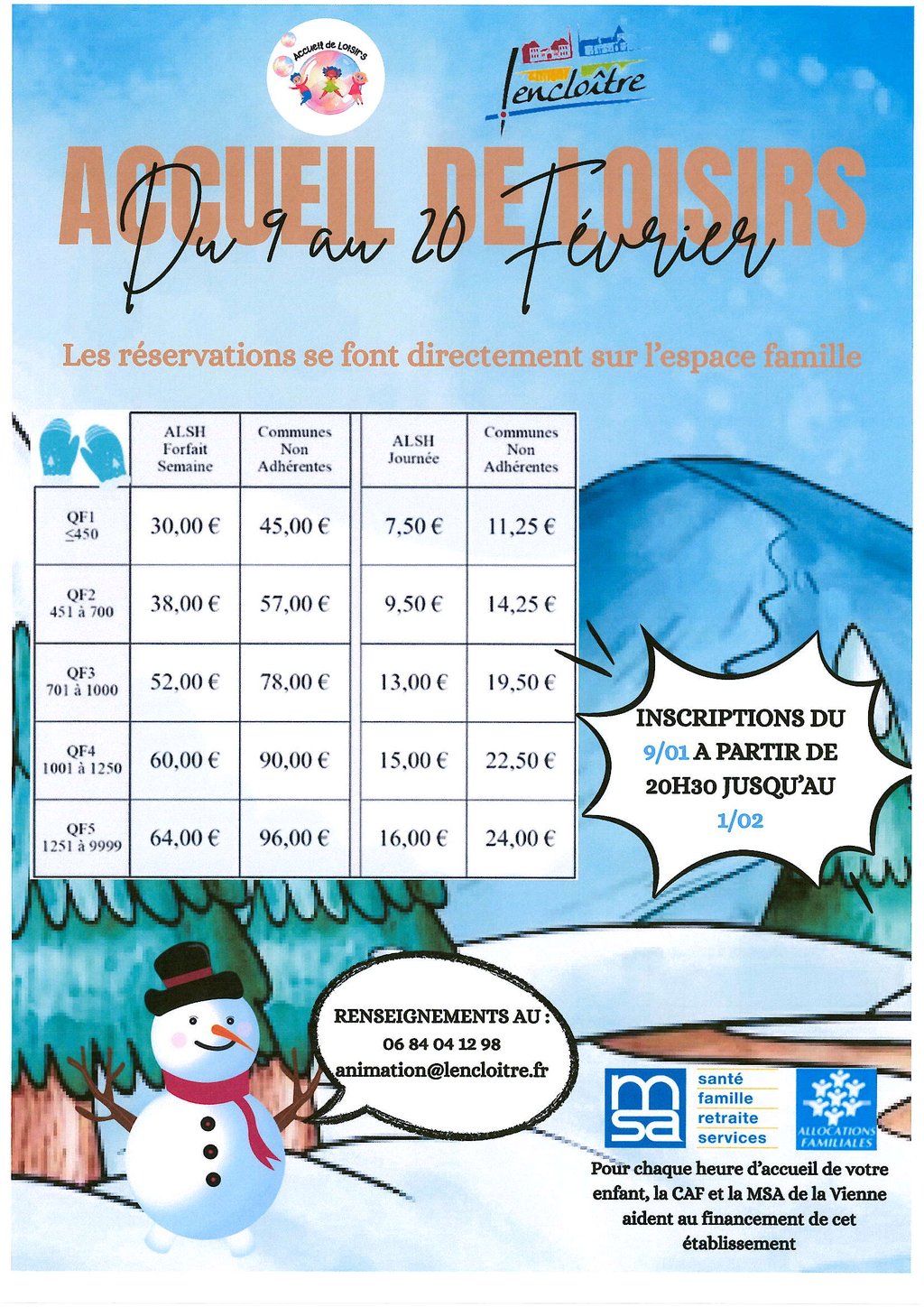 INSCRIPTIONS VACANCES HIVER 2026 ACCUEIL DE LOISIRS