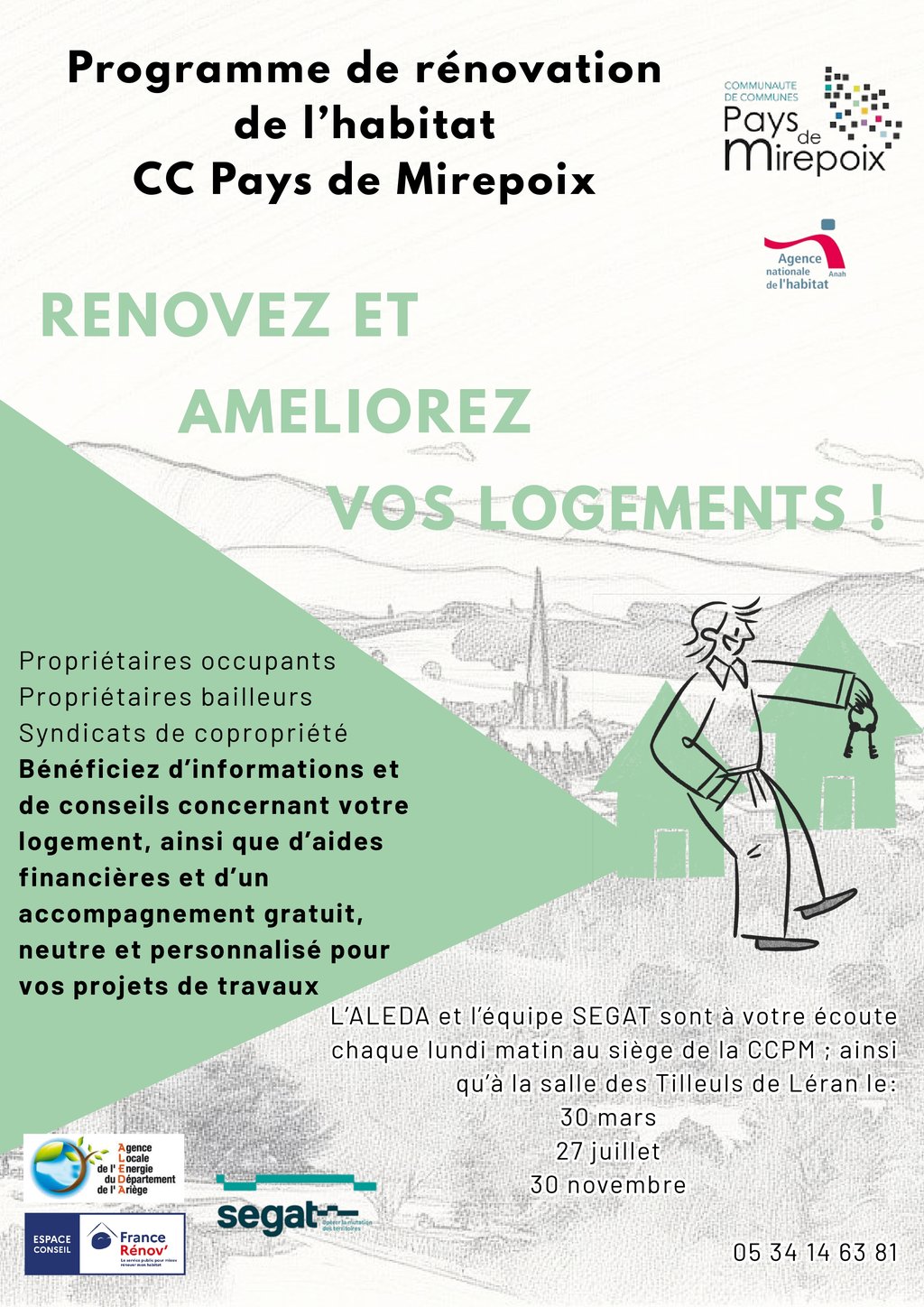 L’ALEDA et l’équipe SEGAT sont à votre écoute chaque lundi matin au siège de la CCPM, 30 cours du Maréchal de Mirepoix, ou à la salle des Tilleuls de LERAN le :