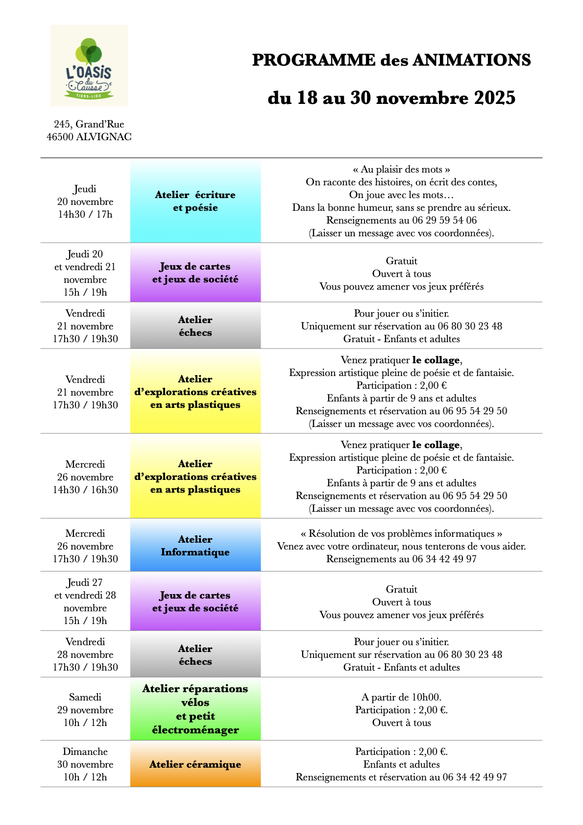 Programme des animations de L'Oasis du 18 au 30 novembre.
