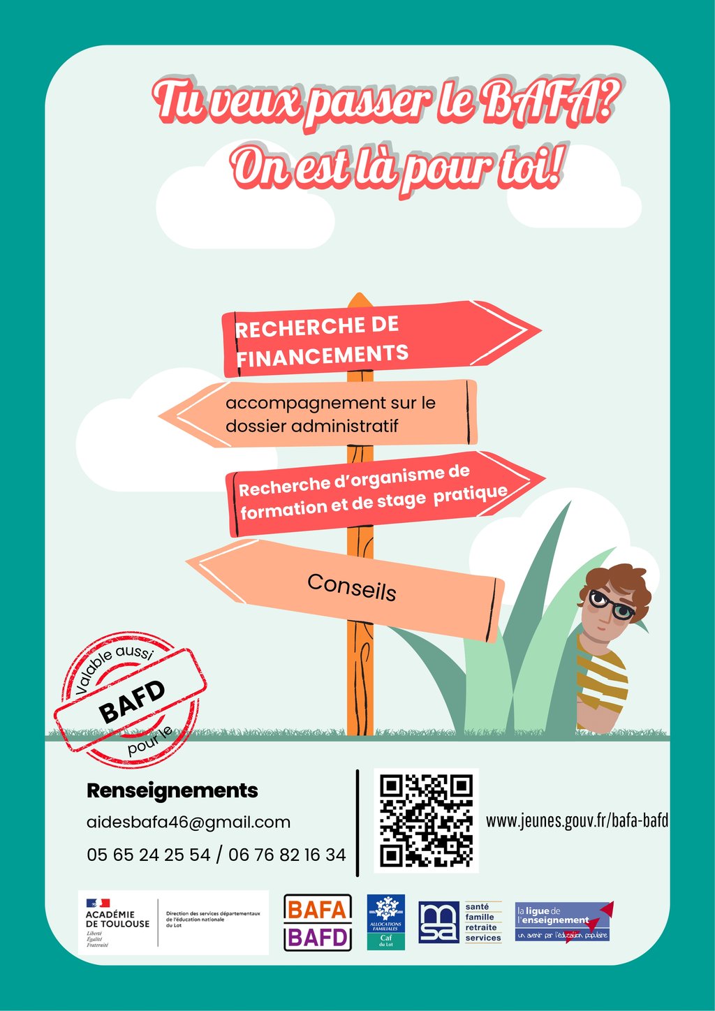 Le Service départemental à la jeunesse, à l’engagement et aux sports (SDJES), la CAF du Lot et la MSA Midi-Pyrénées Nord se sont associés afin de recenser et mieux valoriser les aides financières destinées aux personnes souhaitant s’engager dans une formation BAFA ou BAFD.