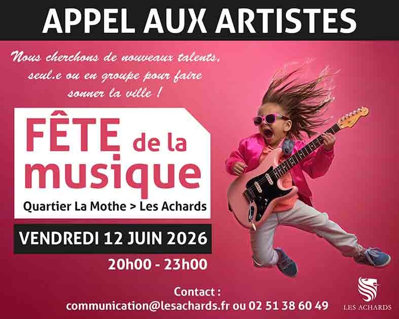 La commune des Achards recherche des groupes musicaux pour sa Fête de la Musique le vendredi 12 juin 2026.