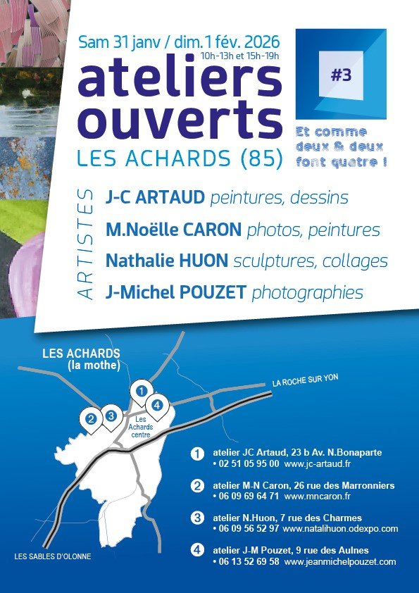 Marie-Noëlle Caron, Nathalie Huon, Jean-Michel Pouzet et Jean-Claude Artaud, vous invitent aux portes ouvertes de leurs ateliers respectifs aux Achards
