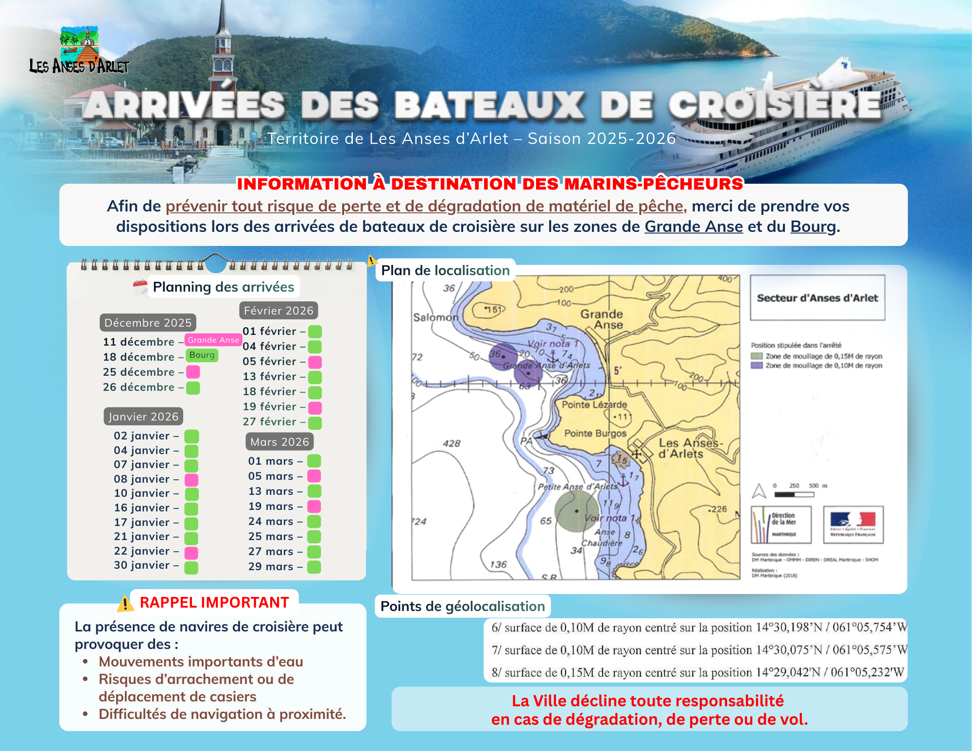 Information à destination des marins-pêcheurs relative aux arrivées de bateaux de croisière sur le territoire de Les Anses d’Arlet – Saison 2025-2026