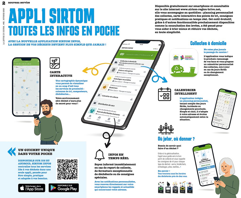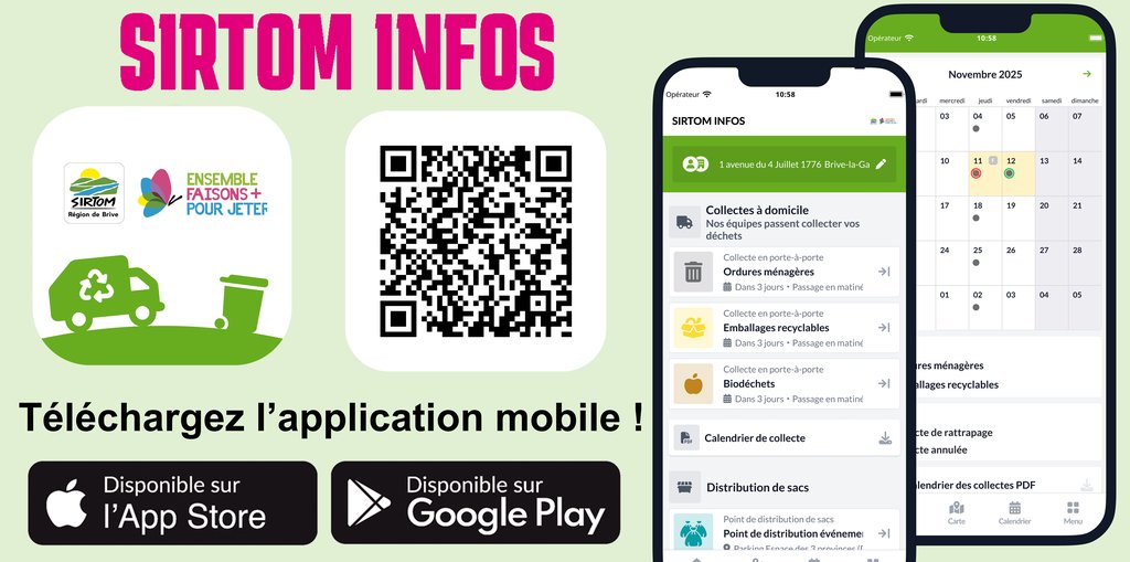 Vous accédez en un clic à toutes les informations qui vous concernent ! Faites défiler les photos et téléchargez l'application gratuitement en scannant le QR code ou en cliquant sur le lien suivant: SIRTOM INFOS · Renseignez une adresse · SIRTOM Région de Brive