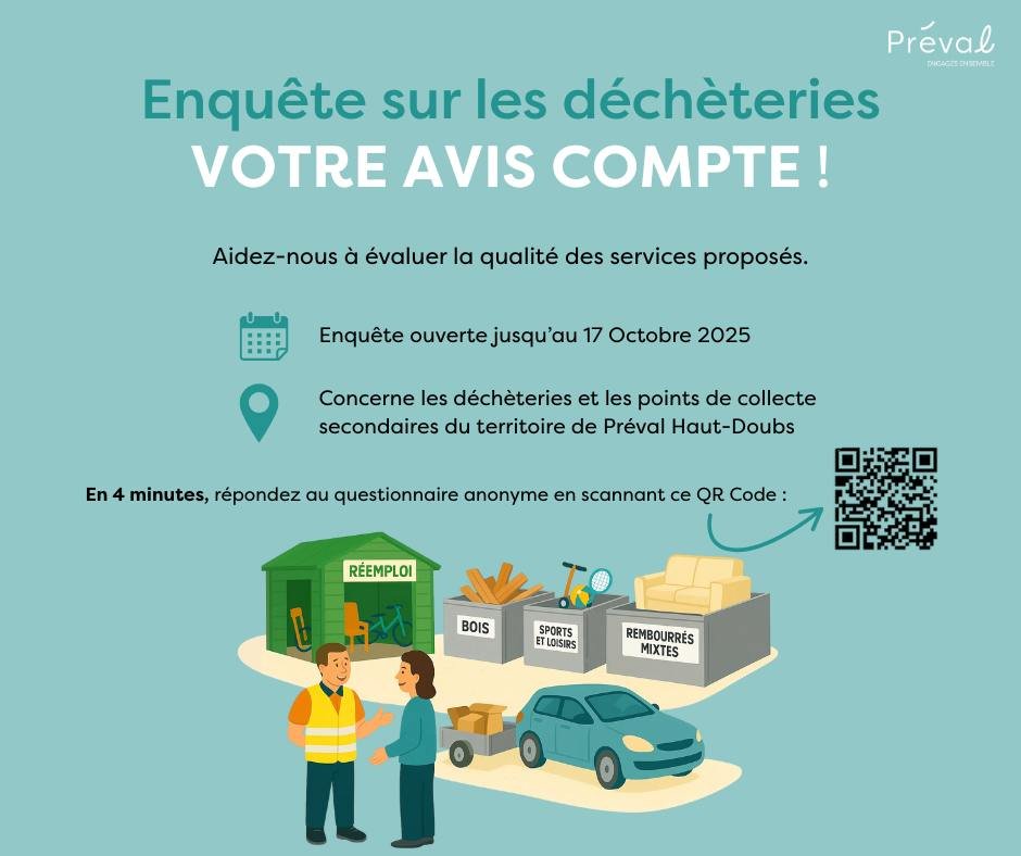 Préval Haut Doubs, en partenariat avec les Communautés de Communes et le Syndicat Mixte de Collecte des Ordures Ménagères, lance une grande enquête auprès des usagers pour mieux connaître leurs attentes et améliorer les services des déchèteries et du réemploi sur notre territoire.