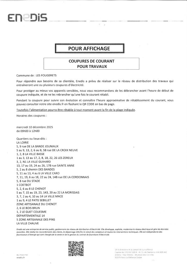 Coupure de courant le 10 décembre de 9h00 à 12h00