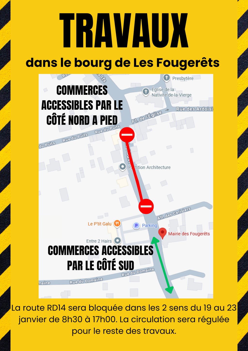 Les commerces et la place de la mairie restent accessibles en voiture par le côté sud de la commune et à pied par le côté nord.