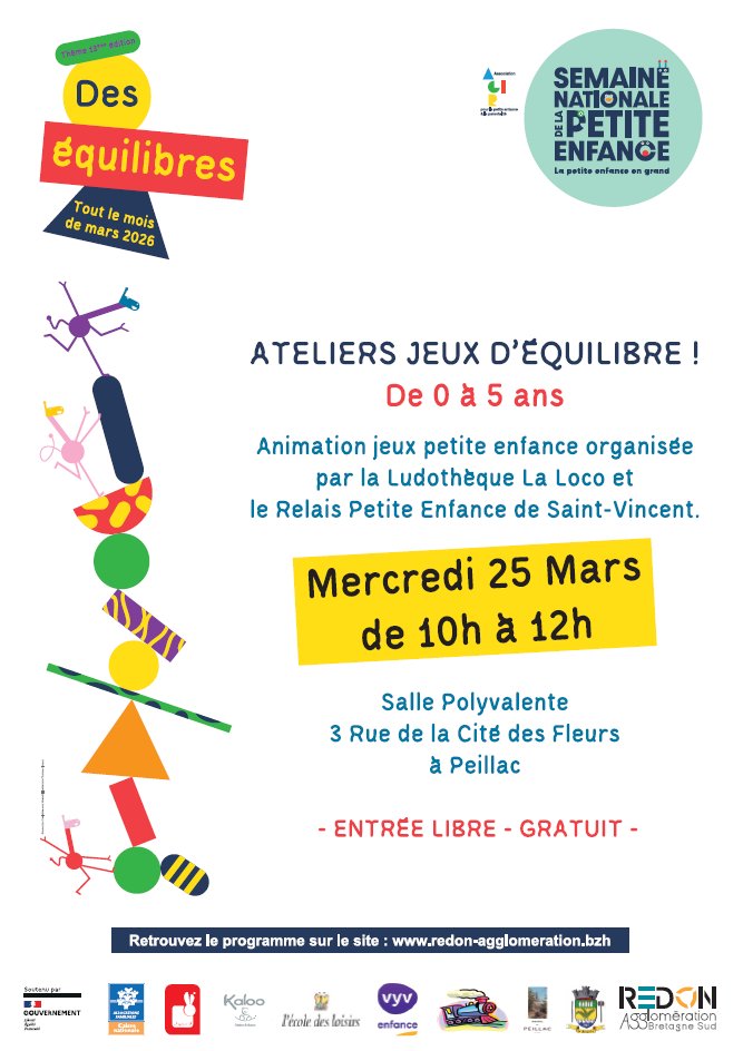 Dans le cadre de la programmation du mois de la petite enfance, proposé par Redon agglomération, la ludothèque La Loco de Peillac et Le RPE de Saint Vincent sur Oust vous proposent de se retrouver le mercredi 25 mars pour une matinée de jeux partagés autour des équilibres. Cette animation est destinée aux enfants de 0 à 5 ans, de leurs parents, grands-parents, assistantes maternelles... autour des jeux d'équilibre.