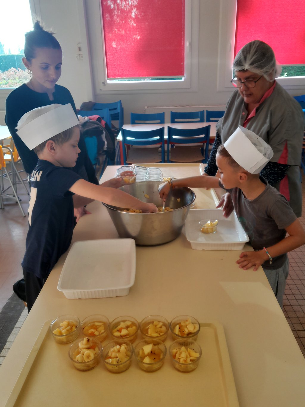 Les enfants se sont impliqués dans ces préparations en épluchant, taillant, fouettant dans un moment de convivialité et d’initiation au métier de cuisinier.