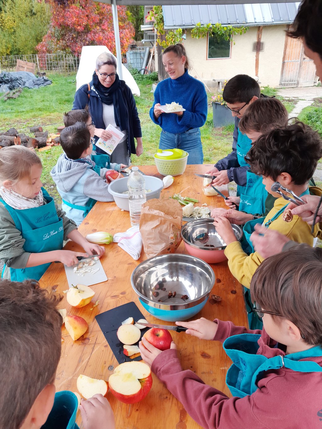 Mercredi 22 octobre, les ateliers de cuisine parents/enfants ont fait leur rentrée. Cette fois-ci, le groupe est allé cuisiner une salade d’automne (pommes et noix du verger, auxquels ont été ajoutés du fenouil et des endives) au verger Maxifruit et a dégusté un sorbet. Au choix : pêche, prune ou poire… pas facile de choisir ! Composé à 70 % de fruits Bio du verger, ces sorbets artisanaux ont régalé petits et grands.