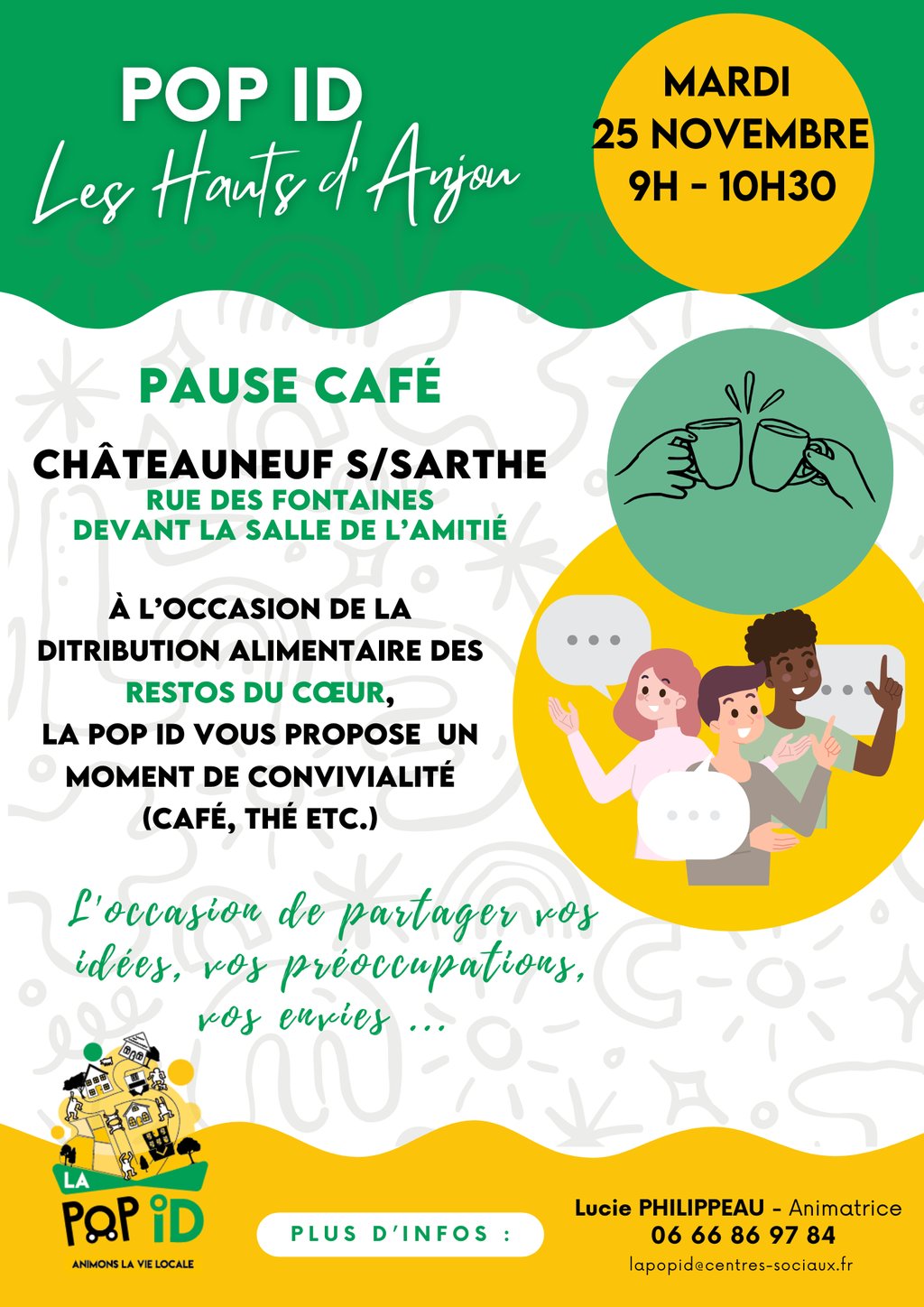 La pop ID sera présente lors de l'ouverture des Restos du cœur, devant la salle de l'amitié pour partager un café, une discussion etc. L'occasion d'échanger sur vos idées, vos préoccupations, vos envies ...