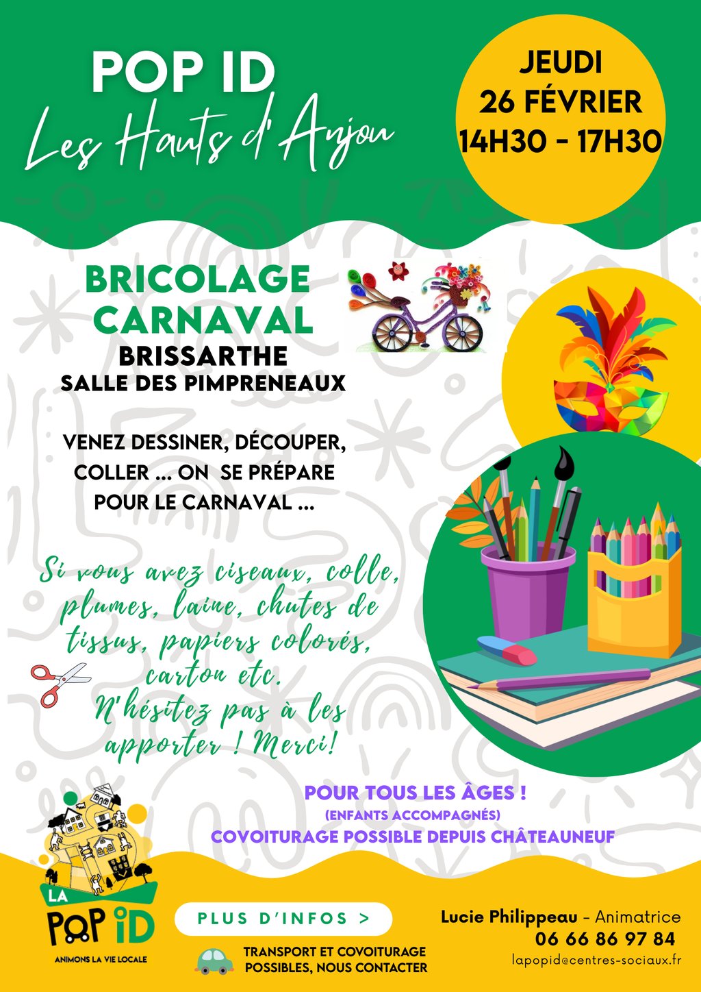 Si vous avez ciseaux, colle, plumes, laine, chutes de tissus, papiers colorés, carton etc. N’hésitez pas à les apporter ! Merci!